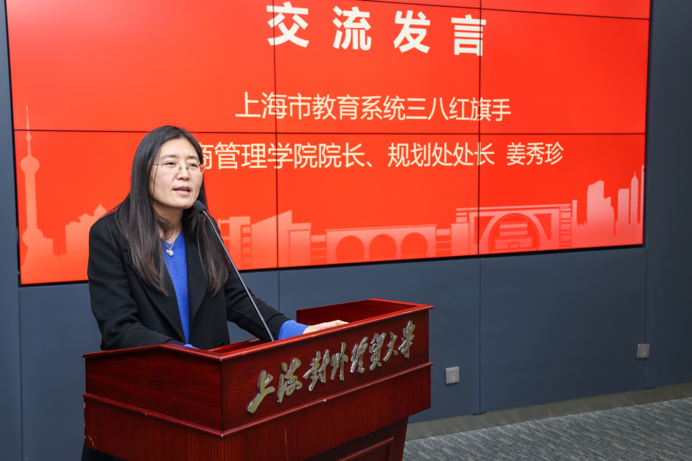 会上,上海市巾帼文明岗获奖单位统计与信息学院经济统计系教师代表李佩瑾、上海市教育系统三八红旗手工商管理学院院长、规划处处长姜秀珍分别作了交流发言。