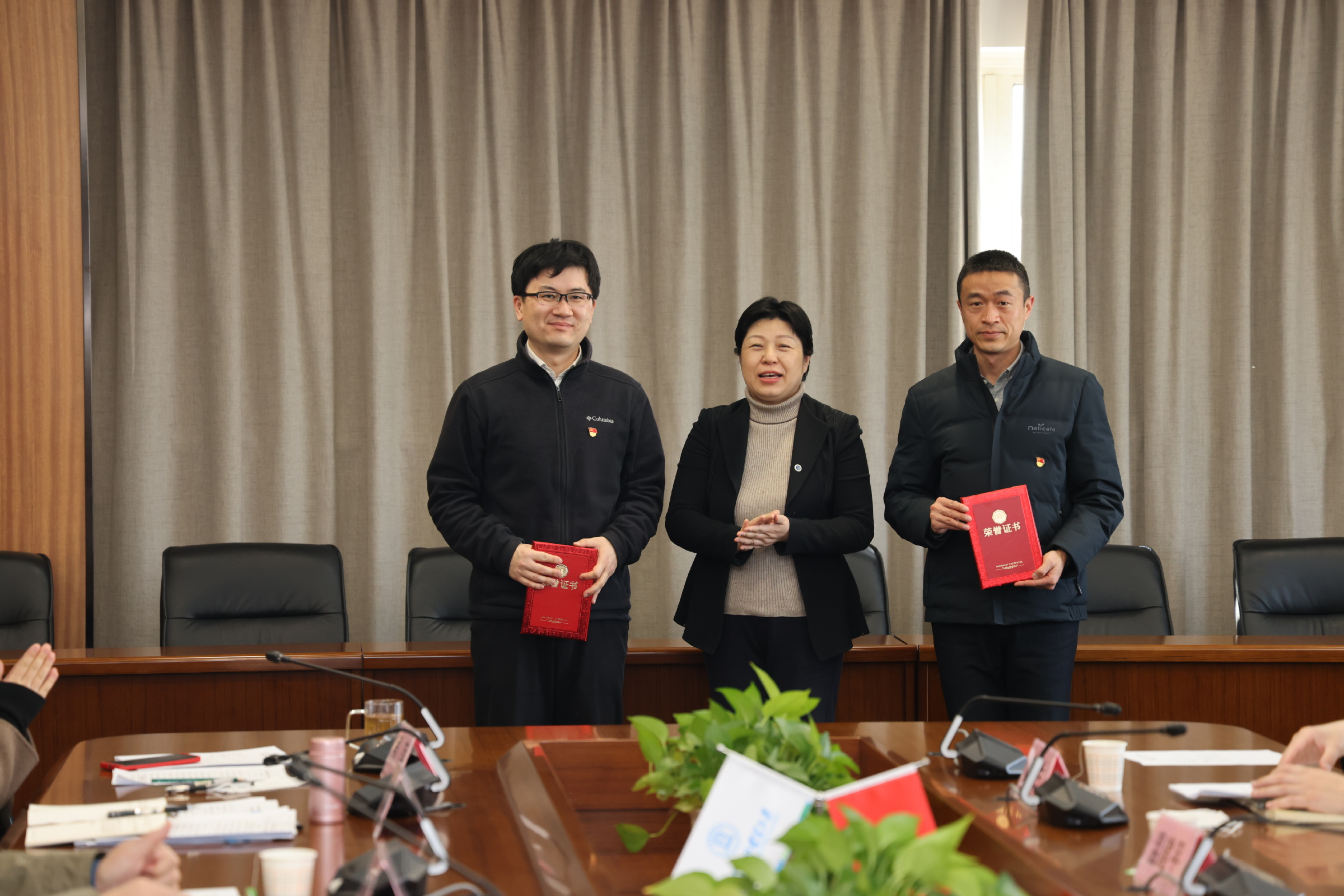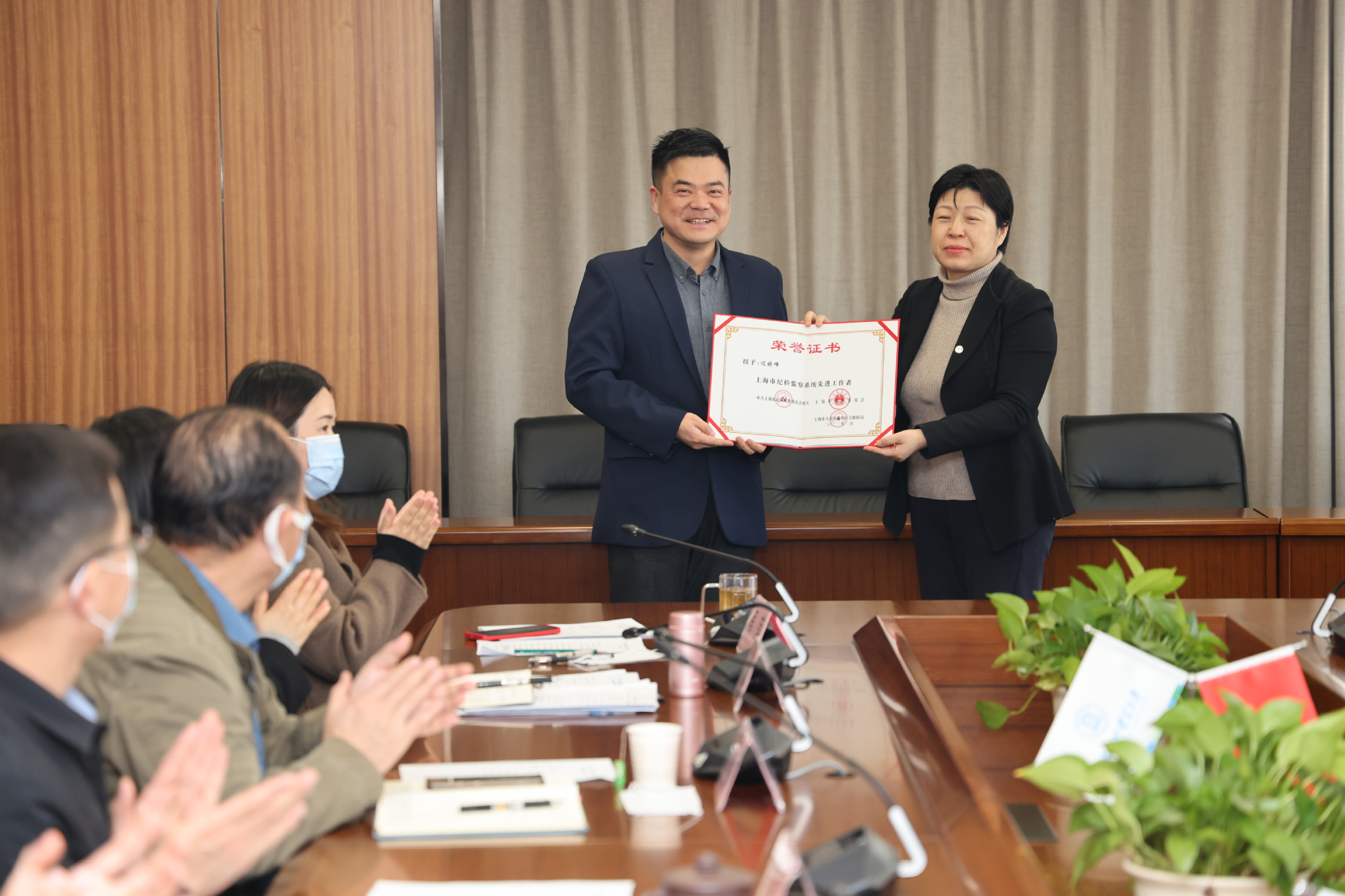 许玫代表学校纪委向获得“上海市纪检监察系统先进工作者”荣誉称号的过晓峰同志和2021年度“必赢626net入口首页优秀纪检工作者”侯占奎、冯昕、刘慧等同志进行表彰并颁发荣誉证书。