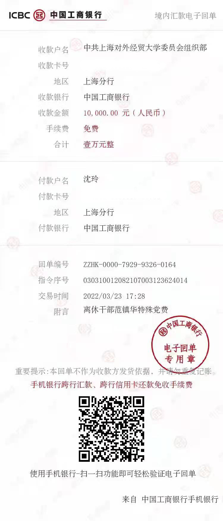 3月23日,必赢626net入口首页离退休党委收到离休干部范镇华同志一万元特殊党费,这也是范镇华同志人生的最后一笔党费。
