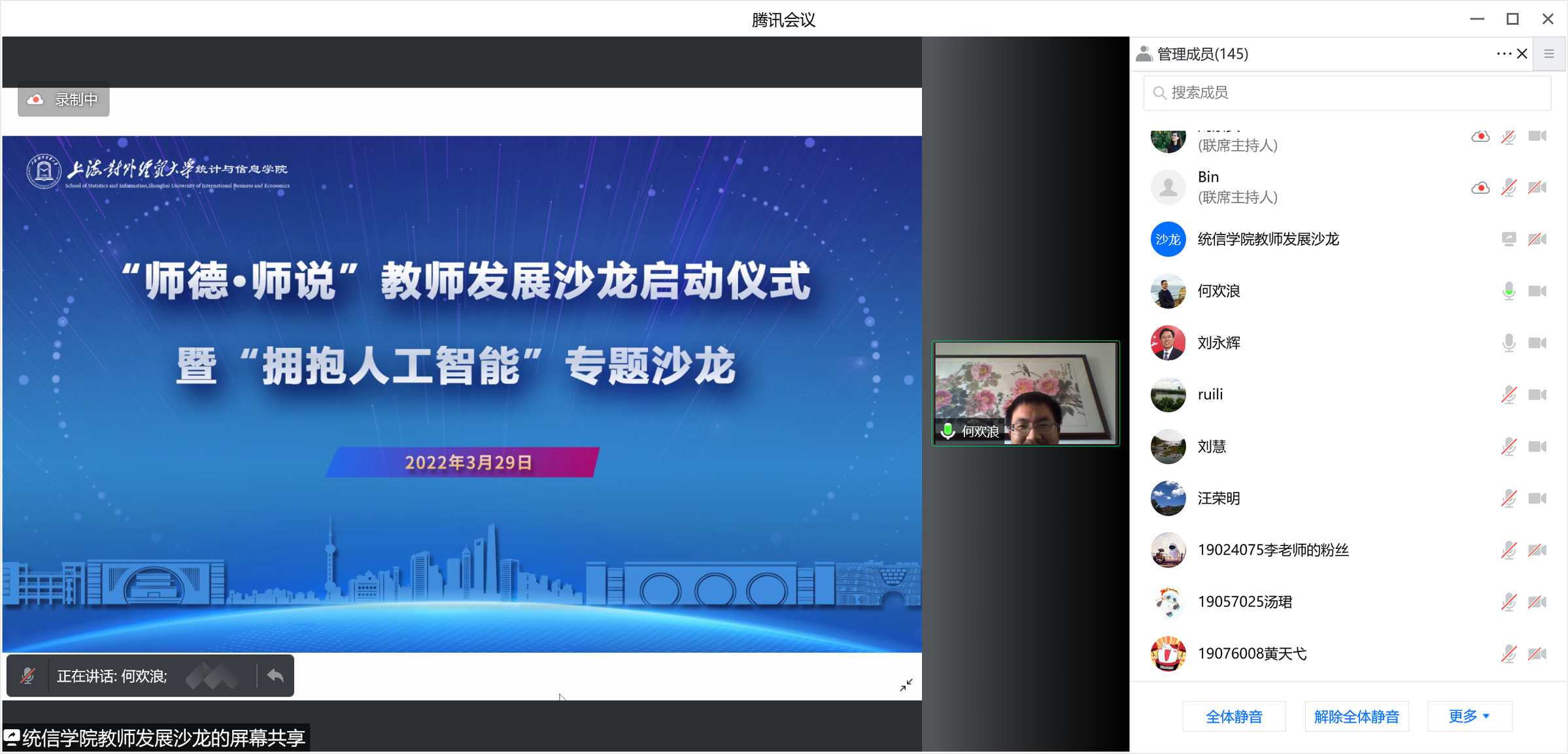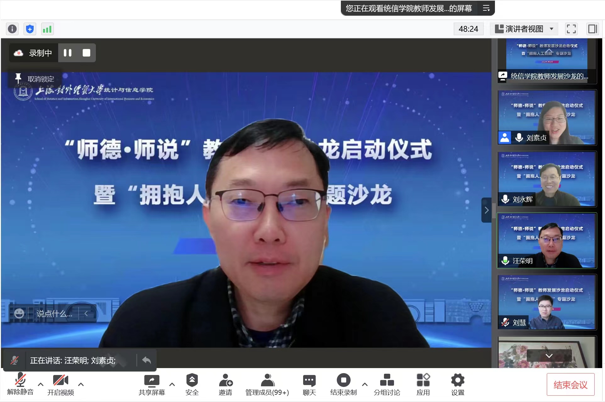 为进一步加强学院新时代师德师风建设,构建教师发展共同体,3月29日下午,统计与信息学院“师德·师说”教师发展沙龙启动仪式暨首场专题沙龙在线举行,校长汪荣明出席并讲话。校科研处处长何欢浪,统计与信息学院领导班子、学院师生150余人参加活动,活动由统计与信息学院院长刘永辉主持。