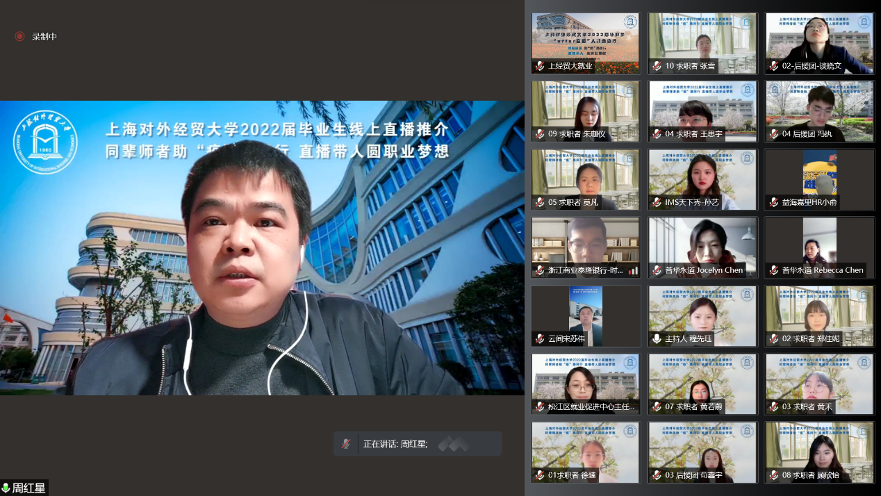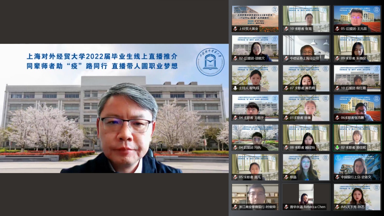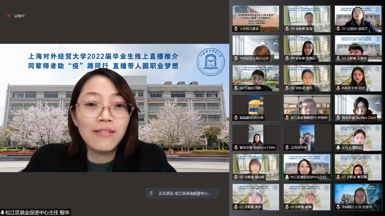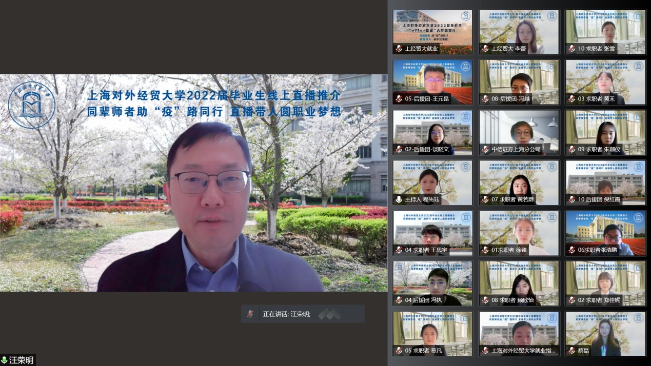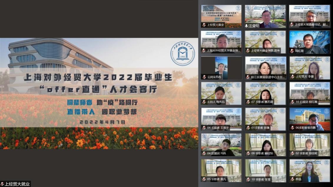 4月7日下午,必赢626net入口首页举行“同辈师者助‘疫’路同行,直播带人圆职业梦想”2022届毕业生线上直播推介会,该推介会是学校针对毕业生推出的“offer直通”人才会客厅首场线上活动。校长汪荣明,校党委副书记、副校长祁明,上海市学生事务中心副主任周红星,长三角G60科创走廊联席办副主任宋苏伟,松江区就业促进中心党支部书记、主任殷华,青年报记者刘昕璐,校党委学(研)工部副部长(主持工作)、学生就业指导中心主任缪韵笛,创业学院副院长高伟出席会议,用人单位代表和来自各学院的求职学生及其后援团参加此次活动。