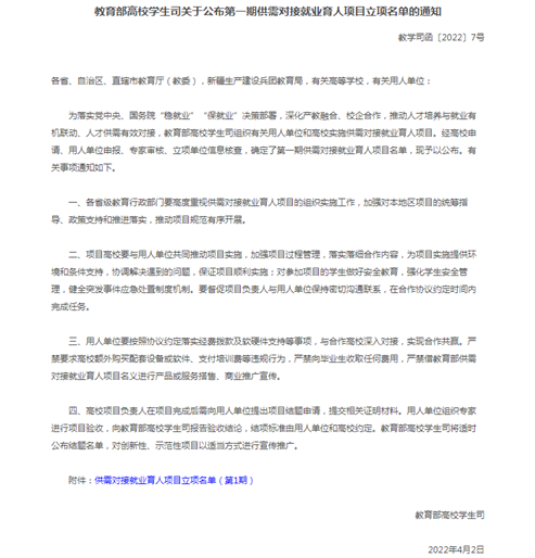 为落实党中央、国务院“稳就业”“保就业”决策部署,深化产教融合、校企合作,推动人才培养与就业有机联动、人才供需有效对接,教育部高校学生司实施了2022年供需对接就业育人项目。