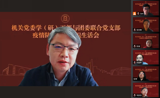 4月15日,学(研)工部与团委联合党支部召开疫情防控专题组织生活会,校党委副书记、副校长祁明出席并讲话。会议通过线上平台举行,由党支部副书记陈颖辉主持。