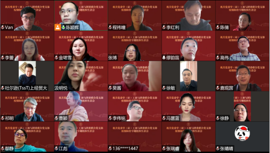 随后,支部代表分别作了交流分享。乔檀介绍了松江学生社区工作专班和辅导员工作情况;高伟介绍了疫情防控条件下的就业工作开展情况;张晴晴介绍了古北校区工作专班工作开展情况;江昊介绍了思政教育工作和社区一线专班负责老师工作开展情况;鹿现国介绍了数据收集、整理和报送等相关工作情况;陈倩介绍了心理教育和心理危机干预相关工作情况;司徒力云介绍了学生志愿者组织工作和学生社区战“疫”临时团支部工作情况;冯葚蓝分享了积极投身防疫一线的经历和感想。
