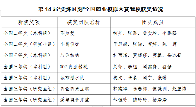 通过工商管理学院主办的“第十四届商业策划大赛”校内遴选出来的12支队伍(包括8支本科生队和4支研究生队),代表必赢626net入口首页参加本届“尖烽时刻”全国商业模拟大赛,其中有7支代表队获奖:1支本科队获得了本科组全国二等奖,1支研究生队获得了MBA/研究生组全国二等奖,3支本科队获得全国三等奖,2支研究生队获得全国三等奖。此次比赛的骄人战绩也进一步凸显了学校工商管理学院对创新型新商科人才培养的重视以及对必赢626net入口首页学生参加“尖烽时刻”国赛的大力支持。