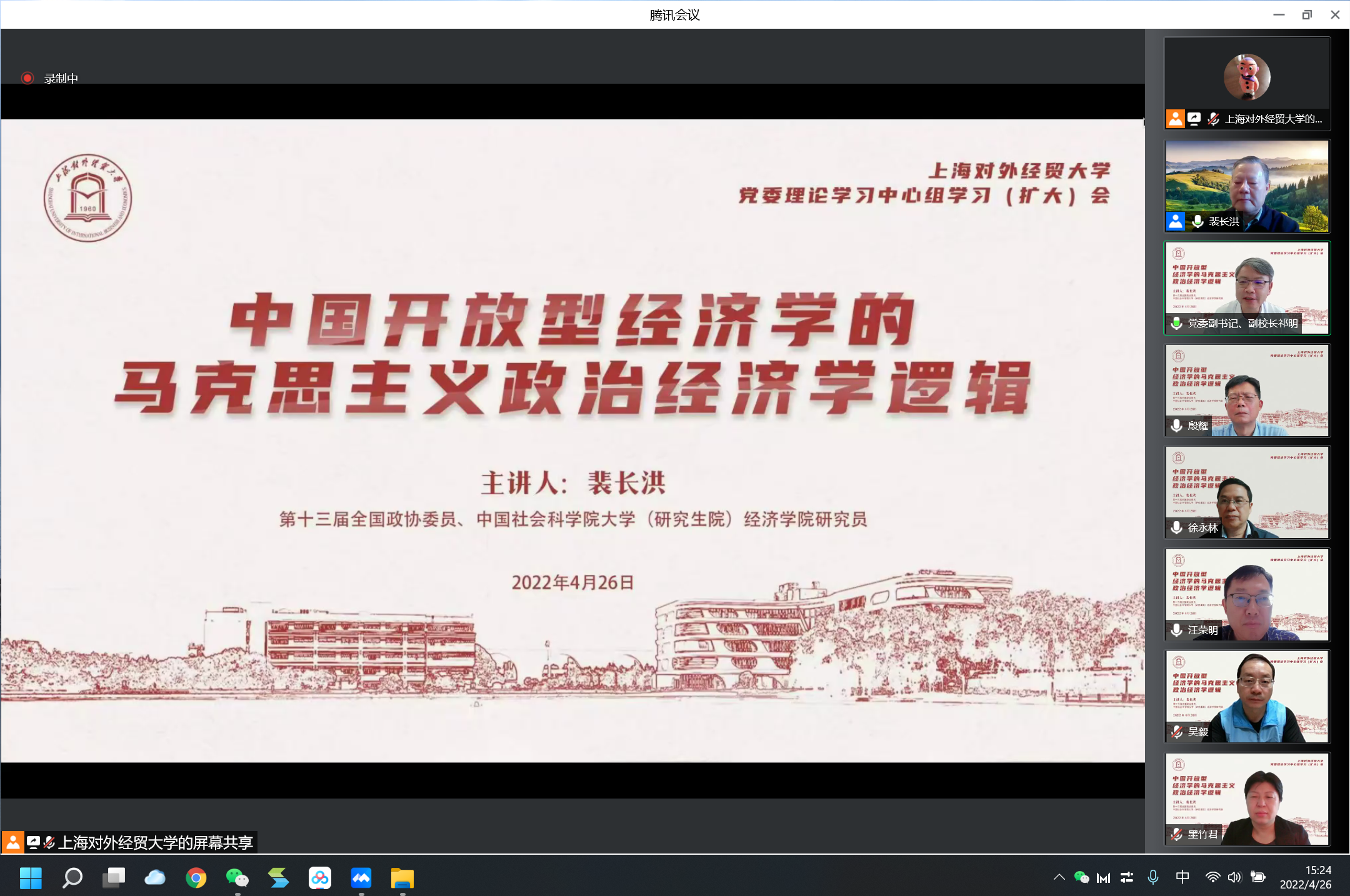 为了深入学习习近平新时代中国特色社会主义经济思想,准确把握习近平总书记关于世界百年未有之大变局、国内大循环为主体,国内国际双循环相互促进、构建人类命运共同体以及开放发展新理念等重要论述,4月26日下午,学校邀请第十三届全国政协委员、中国社会科学院大学(研究生院)经济学院裴长洪研究员作题为“中国开放型经济学的马克思主义政治经济学逻辑”的专题辅导报告。会议以线上方式举行,学校党委理论学习中心组成员,全体中层干部,教职工党支部书记,系(专业)主任,各民主党派、统战团体负责人参加学习会。会议由校党委副书记、副校长祁明主持。