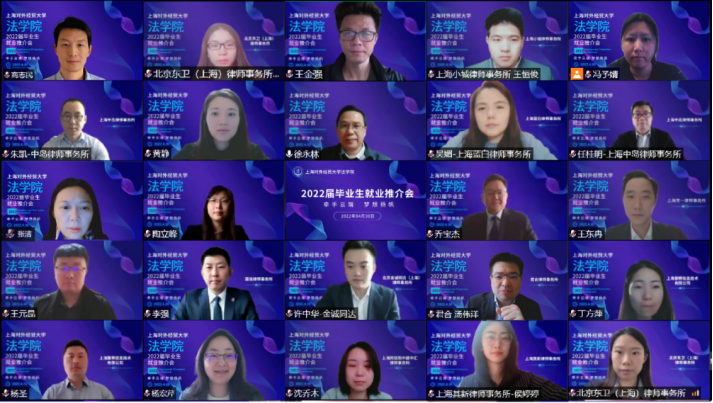 副校长徐永林出席推介会启动仪式。来自君合律师事务所、国浩律师事务所、上海市锦天城律师事务所、北京金诚同达(上海)律师事务所、上海浙实企业发展集团有限公司、金元顺安基金管理有限公司等在内的22家用人单位负责人及代表、法学院领导班子、教师代表、辅导员和200多名学生在线参加推介会。启动仪式由法学院党委副书记商志民主持。