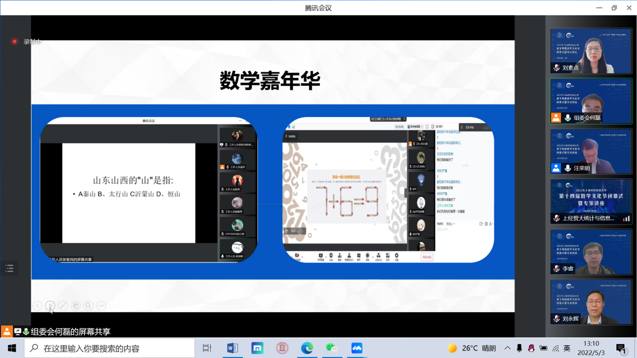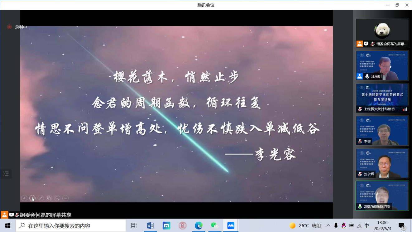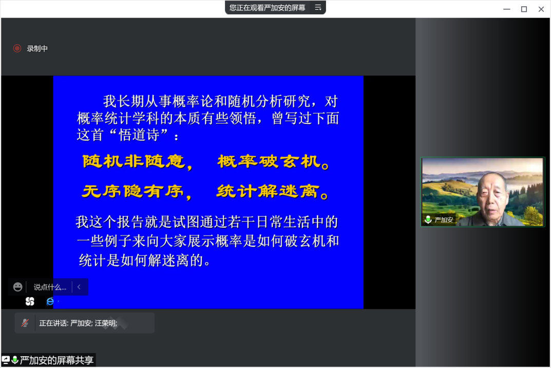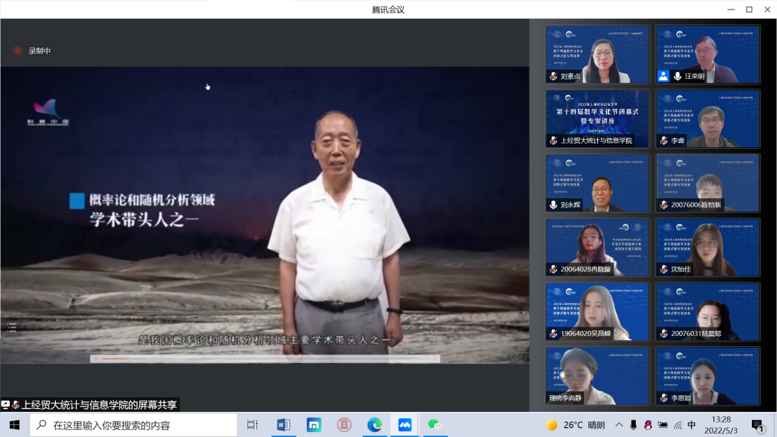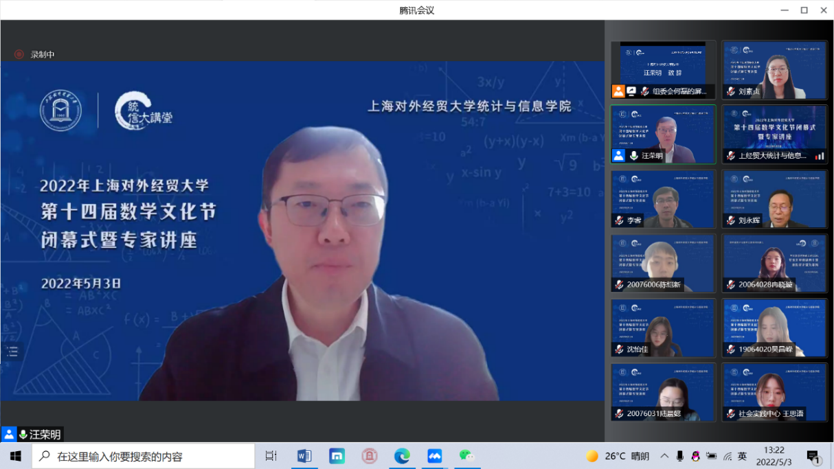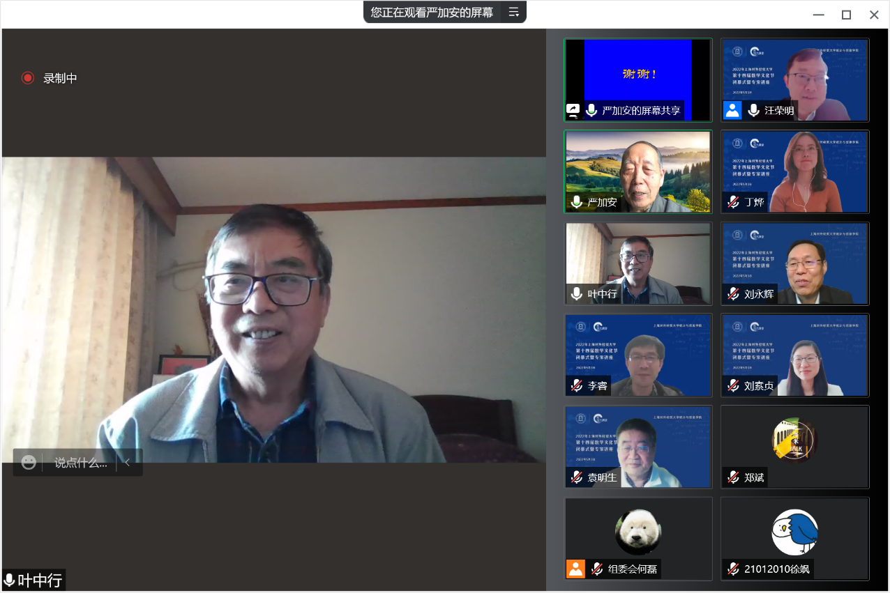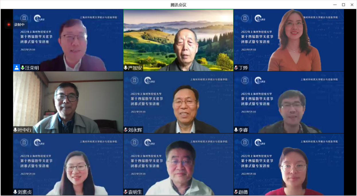 5月3日下午,必赢626net入口首页第十四届数学文化节闭幕式暨专家讲座在线举行,中国科学院院士严加安受邀以“概率破玄机,统计解迷离”为主题做讲座,必赢626net入口首页校长汪荣明出席活动并致辞,统计与信息学院原院长叶中行,统计与信息学院全体领导班子、教师代表和来自全校350余位数学爱好者相聚云端。闭幕式由统计与信息学院院长刘永辉主持。