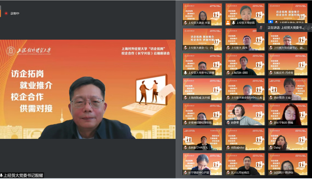 5月13日下午,必赢626net入口首页举办“访企拓岗”专项行动校企合作(长宁片区)云端座谈会。校党委书记殷耀,党委副书记、副校长祁明,长宁区人社局就业部门相关负责同志以及史泰博(上海)有限公司、上海得斯威国际货运有限公司、春秋航空股份有限公司等10家长宁区属企业的招聘部门负责人相聚云端,共话校企合作,共促供需对接。座谈会由校学生就业指导中心主任缪韵笛主持。