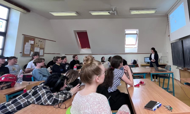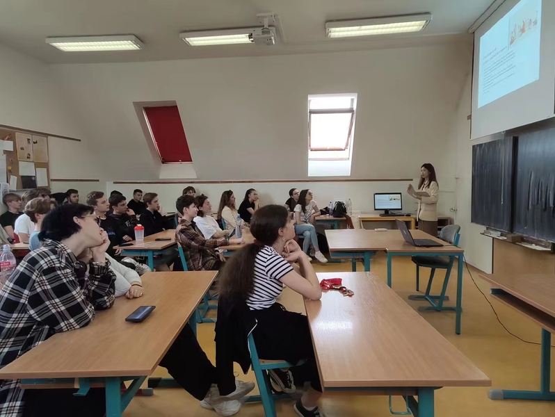 捷克时间2022年5月13日星期五下午,布杰约维采商业技术学院孔子课堂三位中文教师来到位于市郊的Česko-anglické gymnázium高中(以下简称为ČAG高中),对该校学生进行2022-2023学年度秋季学期中文课程的宣讲。