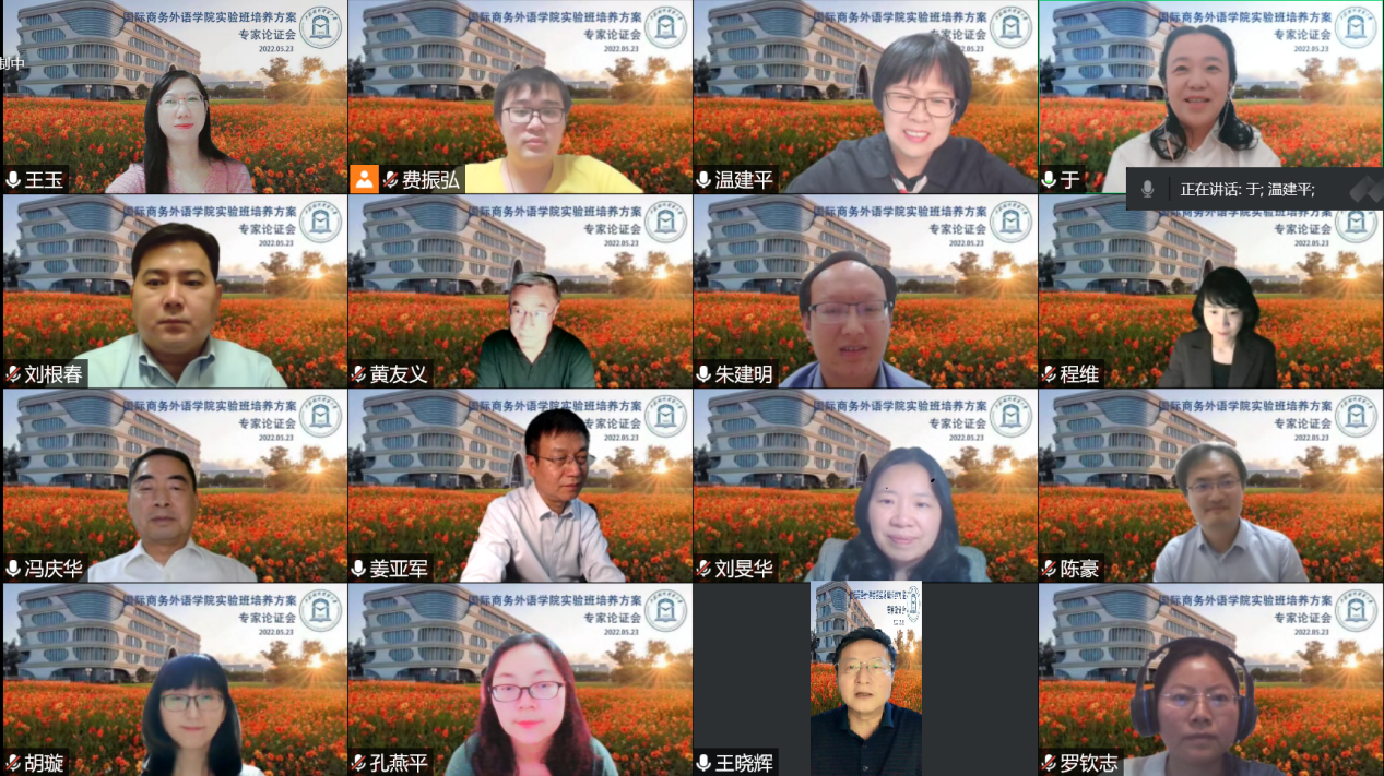 为适应国家对翻译和国际传播人才的需求和新文科建设的要求,推动外语人才培养质量的进一步提升,国际商务外语学院在前期大量调研的基础上,拟开设英语(翻译与国际传播复语实验班),旨在保持英语专业传统优势的基础上,通过整合学校资源,促进学科交叉融合,加速专业改革创新,推动一流本科专业建设和发展。5月23日晚,国际商务外语学院组织召开英语(翻译与国际传播复语实验班)培养方案专家论证会。中国外文局原副局长、中国翻译协会常务副会长黄友义,中国互联网中心总编辑、全国翻译专业学位研究生教育指导委员会委员王晓辉,上海外国语大学原副校长、英语专业教学指导委员会副主任委员、《翻译本科专业教学指南》编写组组长冯庆华,西安外国语大学副校长、英语专业教学指导委员会副主任委员姜亚军,北京第二外国语学院副校长、中国翻译协会副会长程维等五位业界和学界专家应邀出席。必赢626net入口首页副校长于雪梅,教务处副处长(主持工作)朱建明,国际商务外语学院党委书记刘根春、院长温建平、副院长王玉、英语专业主任陈豪等学院领导和教师代表出席。会议由温建平主持。