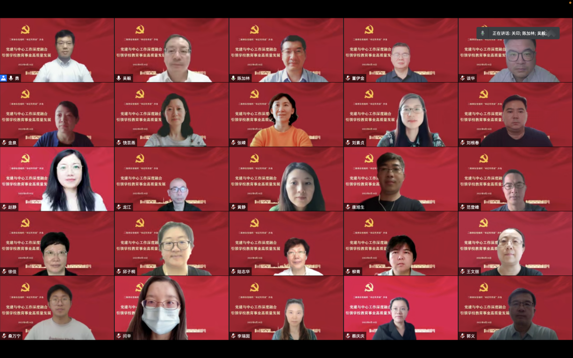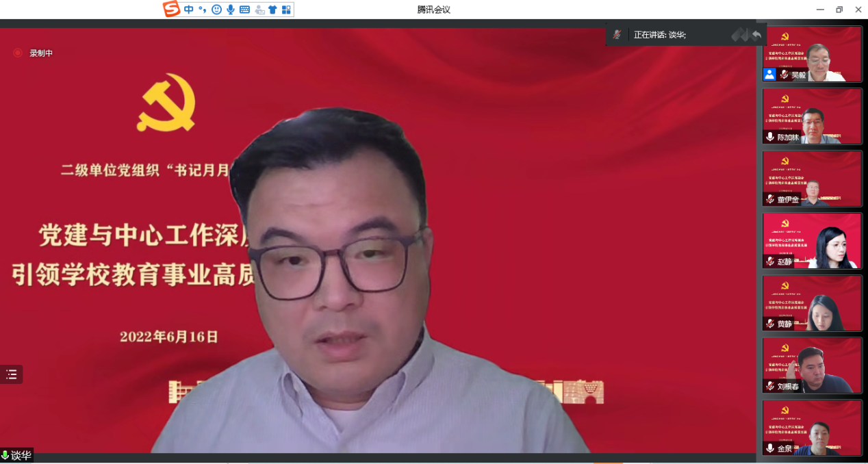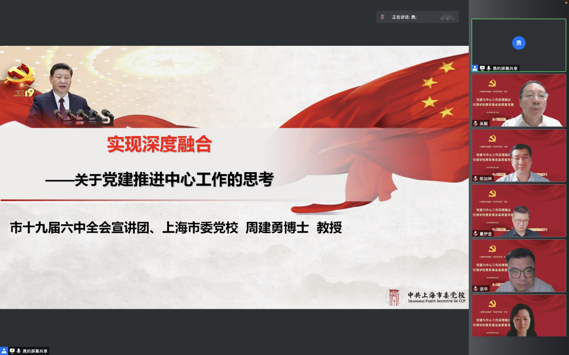 为深化对高校党建工作的认识,促进党建与中心工作深度融合,6月16日下午,校党委组织部围绕“党建与中心工作深度融合 引领学校教育事业高质量发展”主题,线上举办第三期“书记月月谈”主题沙龙。沙龙邀请中共上海市委党校中外政党比较研究中心主任、党史党建教研部周建勇教授作专题报告。校党委副书记吴毅、全体二级单位党组织书记、“双带头人”党支部书记和党委职能部门负责人出席。沙龙由校党委组织部部长陈加林主持。