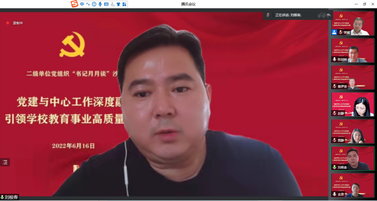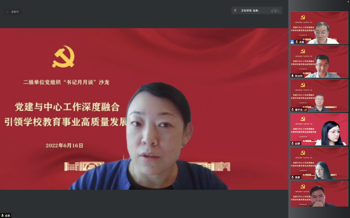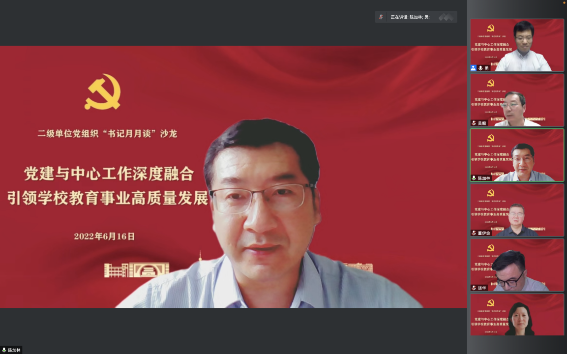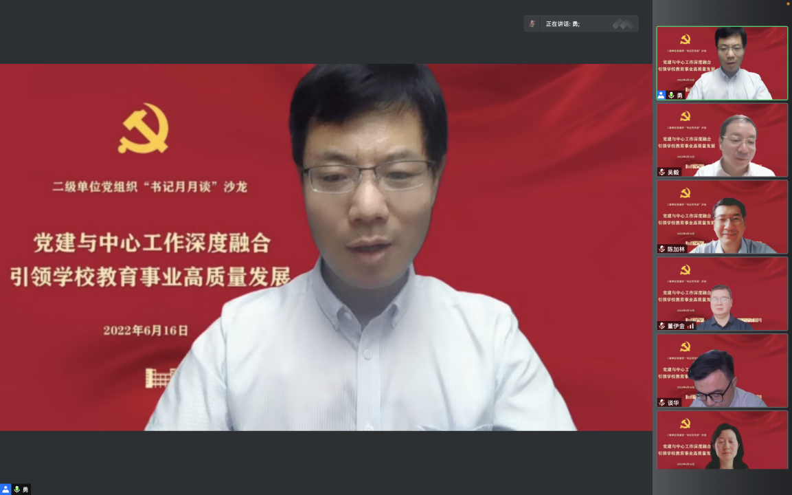 学校“书记月月谈”主题沙龙旨在通过加强二级单位党组织书记、党支部书记的学习交流,积极探索围绕中心抓党建的具体方法,提高推动基层党建工作高质量发展的技能本领。学校将以贯彻落实《中国共产党普通高等学校基层组织工作条例》为契机,进一步加强党建工作,将党建工作转化为学校发展的组织优势、人才优势和发展优势,以高水平党建引领、推动和保证学校高质量发展,跑出“十四五”开局起步的加速度,以实际行动迎接党的二十大胜利召开。