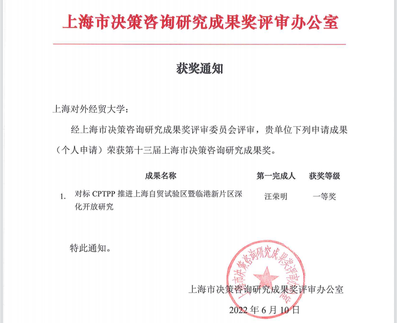 近日,《上海市人民政府关于表彰第十三届上海市决策咨询研究成果奖获奖成果的决定》(沪府〔2022〕16号)正式公布,必赢626net入口首页《对标CPTPP推进上海自贸试验区暨临港新片区深化开放研究》成果荣获第十三届上海市决策咨询研究成果奖一等奖,已连续两届获得上海市决策咨询研究成果一等奖。该成果由汪荣明教授领衔,姚为群、陈子雷、何欢浪、黄志瑾、李墨丝、殷敏、张磊(经贸所)、张娟、叶作义、车春鹂、汪波、应品广等团队成员共同完成。