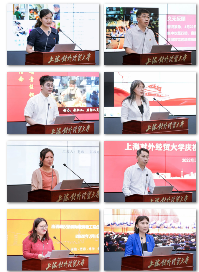 会上,党委学工部副部长、学生处副处长(主持工作)、校团委书记缪韵笛,校工会常务副主席唐旭生,工商管理学院学生党员严润杰,马克思主义学院教工第二党支部书记李秀敏,国际经贸创新与治理研究院副院长、学校办副主任(兼)夏玮,国际经贸学院经济学系党支部教师党员焦振华,国际商务外语学院法语和汉语国际教育教工联合党支部书记游晓航,学校办公室主任、会计学院党委书记张嵘分别围绕学校疫情防控工作专班、下沉干部支援社区一线、学生党员志愿者队伍、全国样板党支部示范引领作用、党建引领学校智库建设、党员教师“为党育人、为国育才”、市第十二次党代会见闻体会等主题作了交流发言。