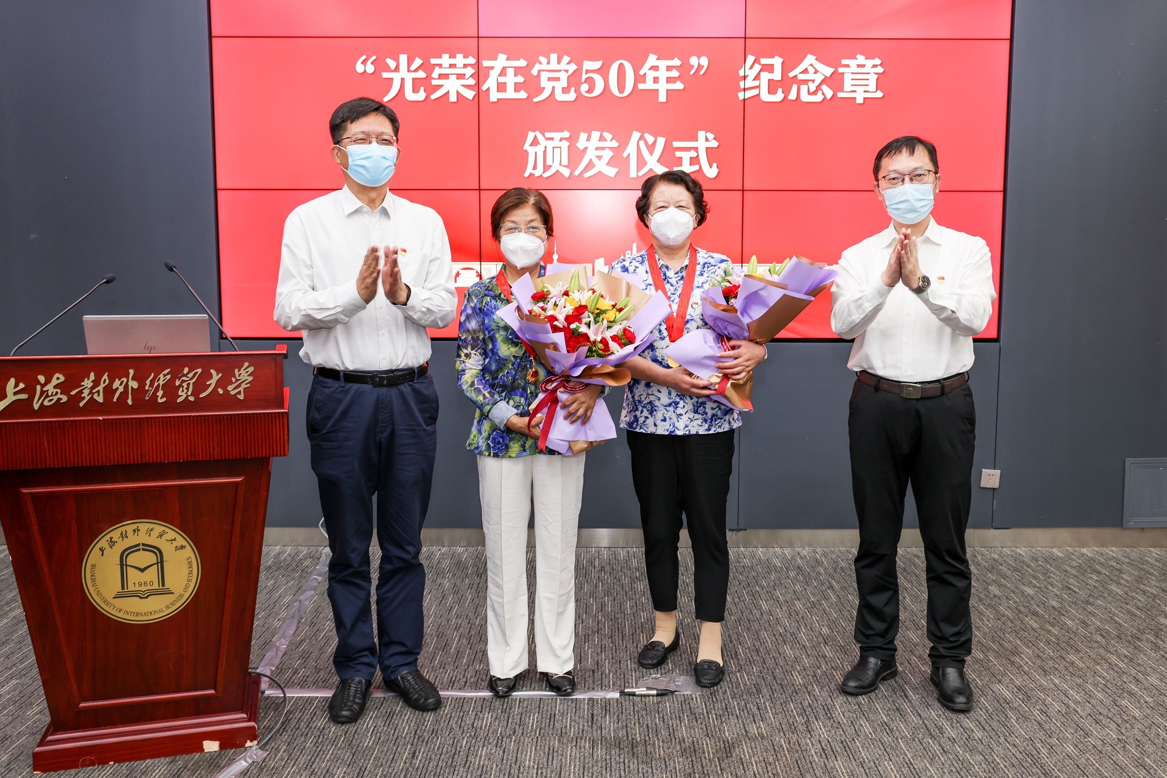 会上,校党委书记殷耀、校长汪荣明为离退休党员代表杨淑娥、朱淑英颁发了“光荣在党50年”纪念章。