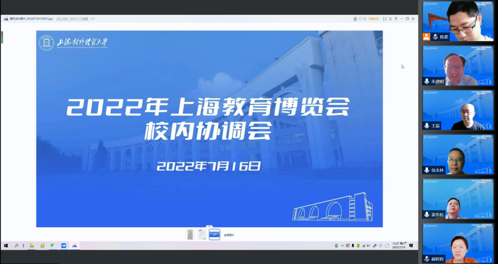 2022年第十九届上海教育博览会教育数字化转型展(以下简称“教博会”)主题聚焦“数字新时代 教育大未来”,定于9月下旬至10月下旬在线上举行。为了做好相关参展工作,7月16日下午,学校在线召开教博会校内协调会,副校长徐永林出席会议,学校办公室、教务处、科研处、研究生院、学生处和招生就业处等部门负责人及具体工作人员参加会议。