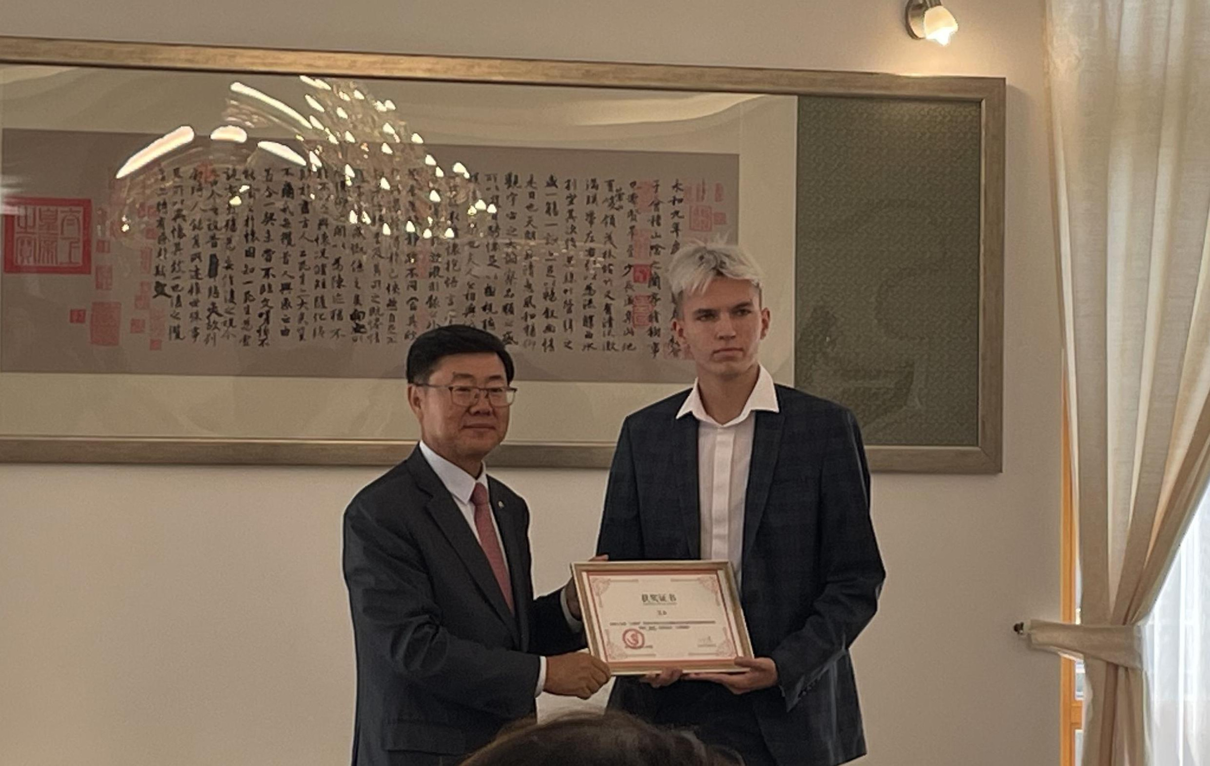 中国驻斯洛伐克大使孙立杰为获奖选手们颁发奖品并合影留念。考门斯基大学东亚语言文化系学生王爱娃(Eva Vrablova)荣获第二十一届“汉语桥”世界大学生中文比赛二等奖。班斯卡中斯双语高中学生艾多(Renat Lehotsky)荣获第十五届“汉语桥”世界中学生中文比赛一等奖。