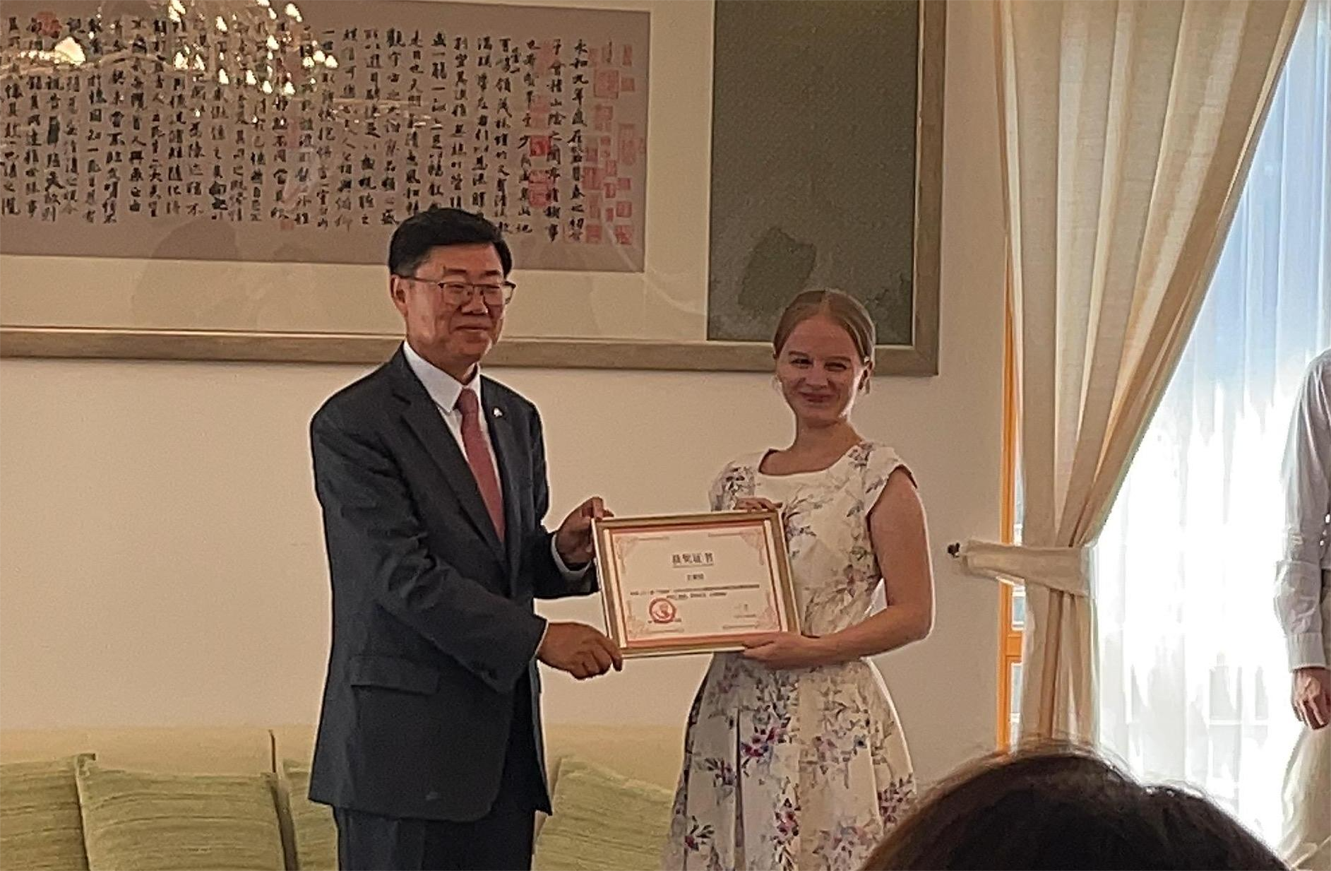 8月25日,第二十一届“汉语桥”世界大学生中文比赛与第十五届“汉语桥”世界中学生中文比赛(斯洛伐克赛区预选赛)颁奖仪式在我国驻斯洛伐克共和国大使馆举行。