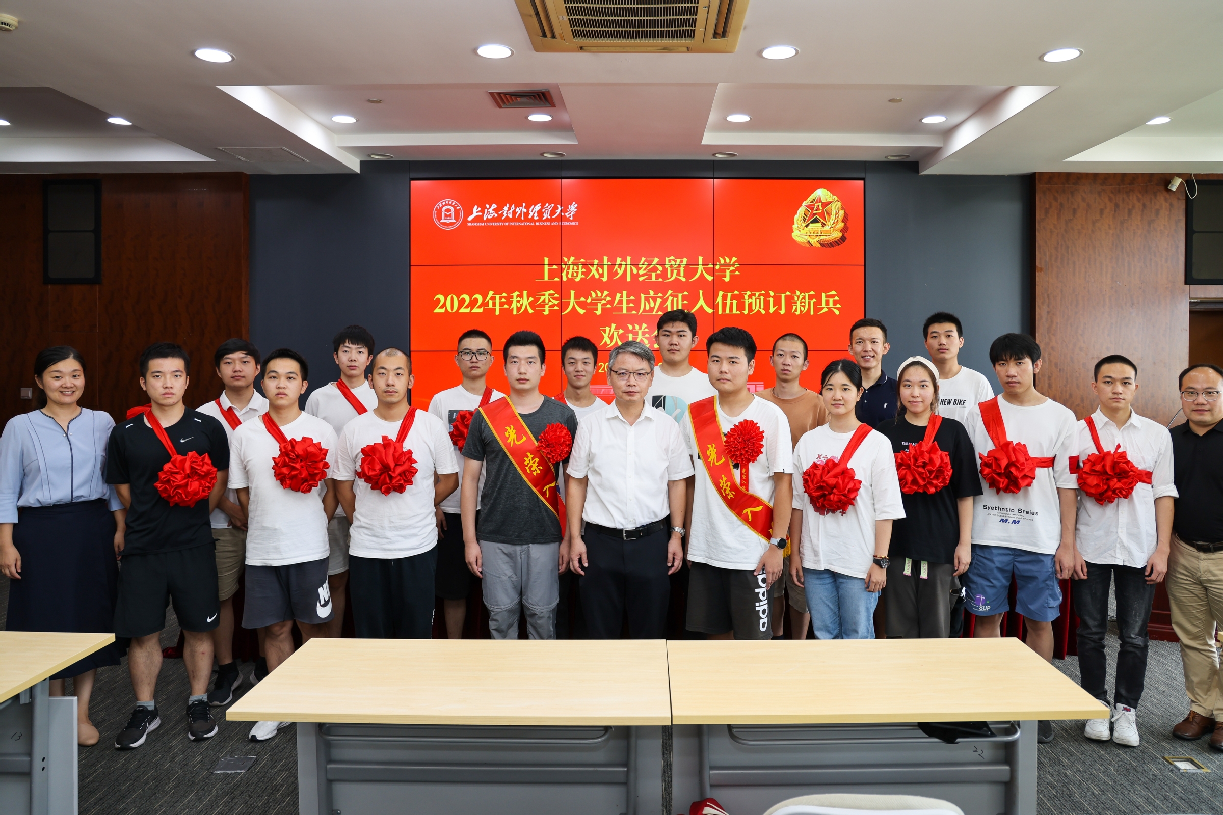 9月2日下午,2022年秋季大学生应征入伍预定新兵欢送会在松江校区图文信息大楼503会议室举行。校党委副书记、副校长祁明,党委学(研)工部、武装部部长缪韵笛,党委学工部副部长陈颖辉,各有关学院党委(总支)副书记、辅导员及全体预定新兵出席欢送会,会议由陈颖辉主持。