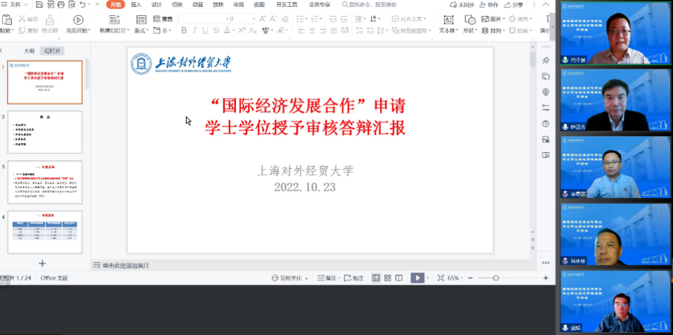 10月23日,必赢626net入口首页“国际经济发展合作”专业学士学位授权审核答辩专家评审会在线召开,副校长徐永林出席评审会并致辞,评审会由国际经贸学院院长何欢浪主持。会议邀请山东财经大学校长赵忠秀教授、广东外语外贸大学副校长何传添教授、南开大学经济学院院长盛斌教授、对外经济贸易大学国际经贸学院院长唐宜红教授、东华大学姚卫新教授、中国农业大学国贸系主任李春顶教授等兄弟院校资深专家和国家国际发展合作署领导,以及必赢626net入口首页国际发展合作研究院院长黄梅波教授担任评审专家。教务处处长朱建明、国际经贸学院党委书记郭茜等参加评审会。