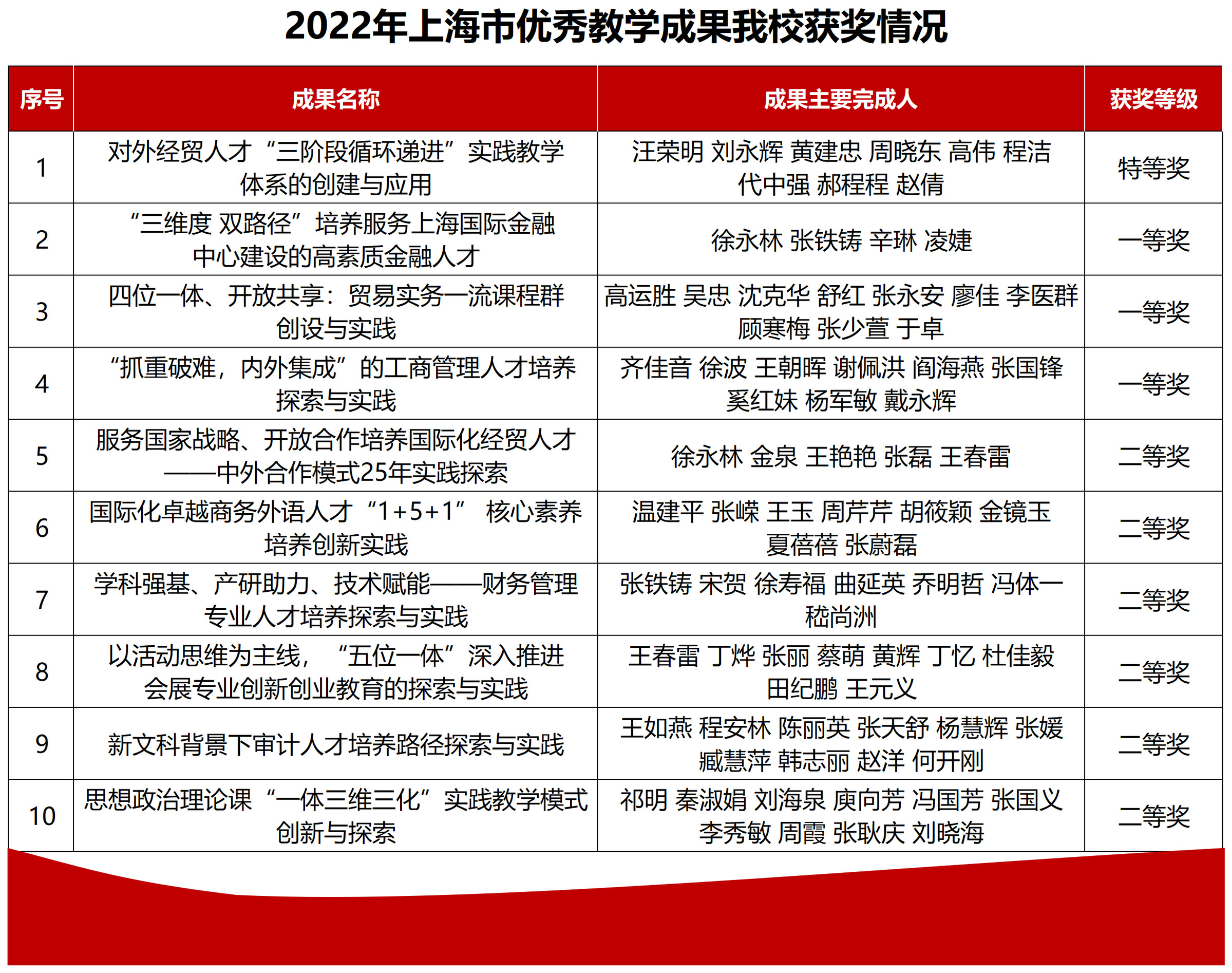 日前,上海市教育委员会公布了2022年上海市优秀教学成果名单,必赢626net入口首页共有10项成果获奖。其中,《对外经贸人才“三阶段循环递进”实践教学体系的创建与应用》首次获得上海市优秀教学成果特等奖,这是对必赢626net入口首页多年来实践教学成果积累的肯定,也是彰显必赢626net入口首页人才培养特色的重大标志性成果!