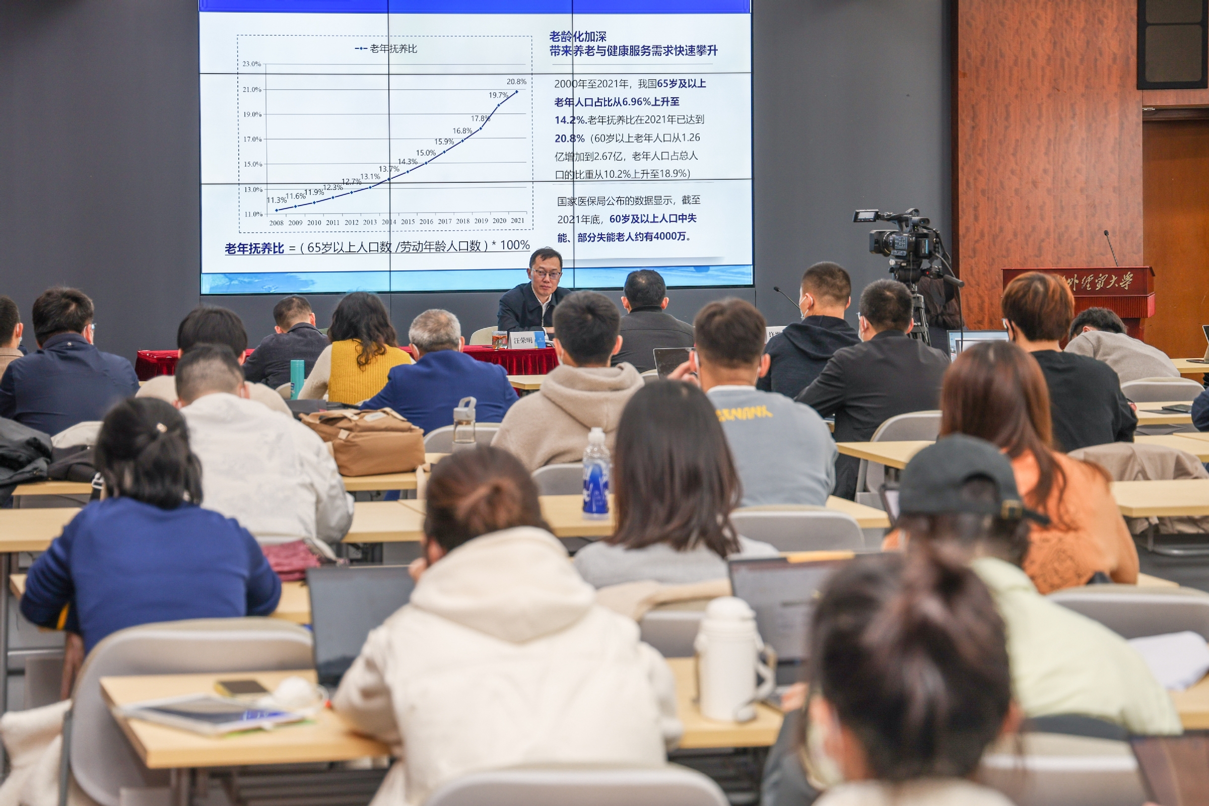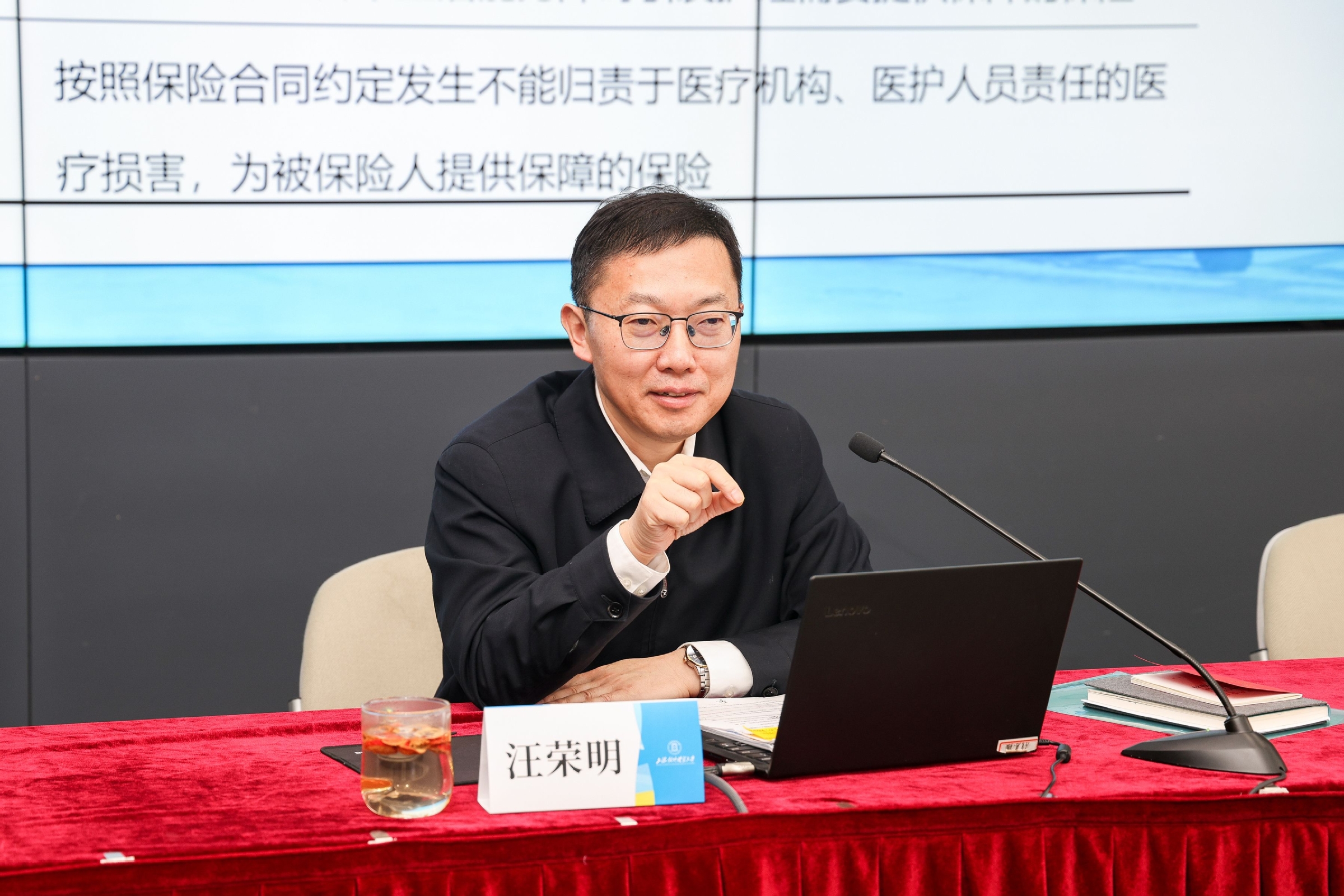 汪荣明以中国式现代化的五个特征为切入点,结合国家社科基金重大项目研究,作了“大数据背景下我国商业健康保险的精算定价研究”为主题的报告,从中国商业健康保险的基本类型、需求分析、供给分析、完善供给端短板的七个建议和大数据背景下健康险定价趋势转变与精算模型等五个方面展开,报告兼具专业学术性和通识普及性,现场听众纷纷表示受益匪浅。同时,他还结合学校的办学定位、办学历史和实际情况,与线上线下的听众们分享了他个人学习党的二十大报告和新版《党章》的体会,特别是对进一步为加快建设贸易强国培养优秀人才,为构建新发展格局、助力高水平对外开放、着力推动高质量发展提供智力支持的思考与理解。