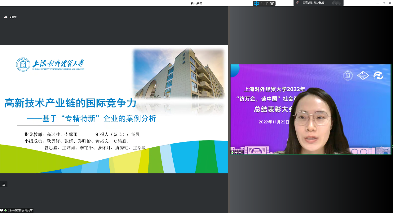 国际经贸学院博士研究生杨晨以《高新技术产业链的国际竞争力——基于“专精特新”企业的案例分析》为主题作项目成果展示。该团队由本硕博学生组成,以“专精特新”企业为重点调研对象,深入了解并评估企业韧性以及所在产业的产业链稳定性和国际竞争力。调研报告荣获团中央2022年“三下乡”“返家乡”社会实践优秀调研报告。