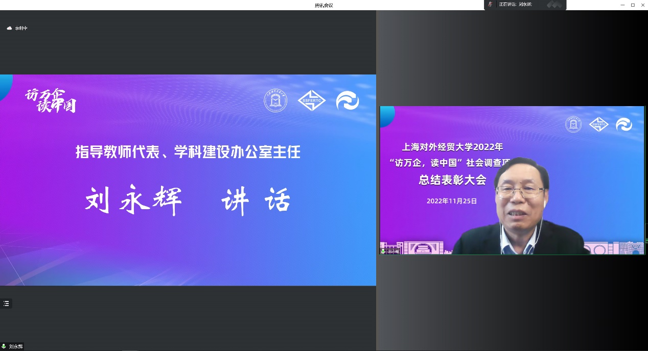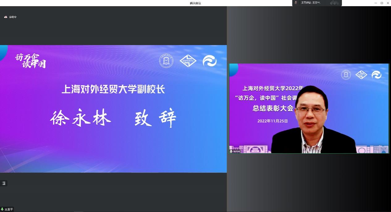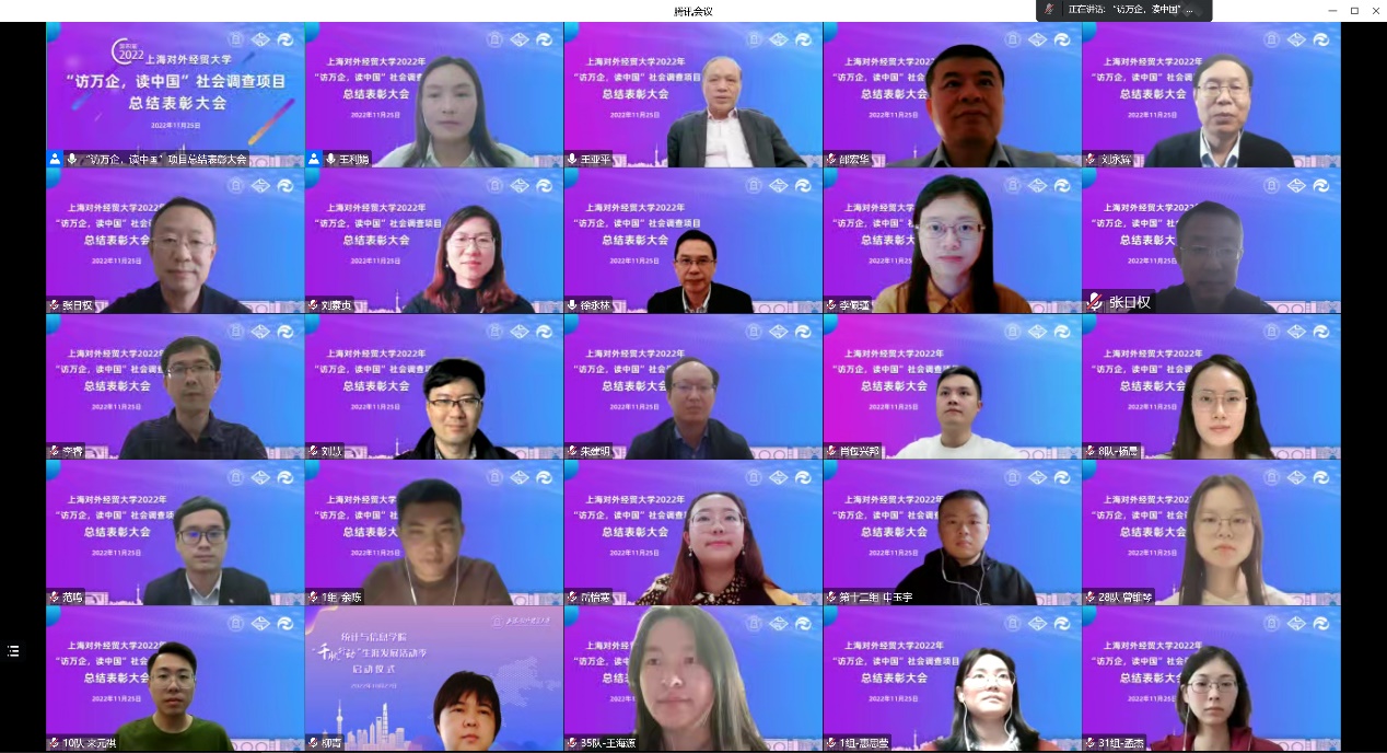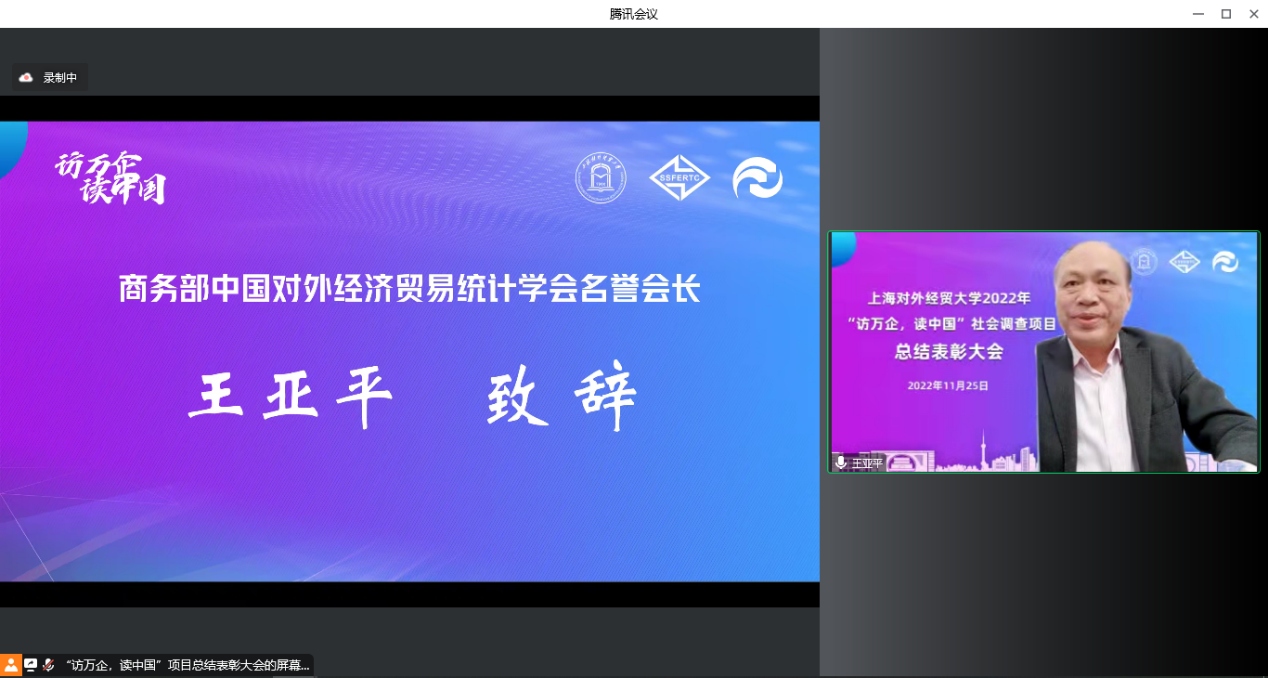 11 月 25 日下午,2022年“访万企,读中国”社会调查项目总结表彰大会在线上顺利举行。中国对外经济贸易统计学会名誉会长王亚平,必赢626net入口首页副校长徐永林,环球慧思(北京)信息技术有限公司总裁邵宏华,校学科建设办公室主任刘永辉,教务处处长朱建明,党委研工部副部长、研究生院副院长乔檀,统计与信息学院领导班子及项目师生代表共计100余人出席。会议由统计与信息学院副院长王利娟主持。