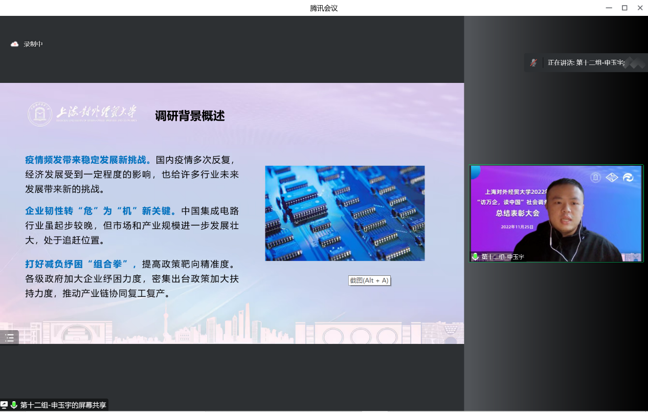 统计与信息学院硕士研究生申玉宇代表调研团队作了分享,团队聚焦芯片“卡脖子”问题,对长三角地区集成电路行业产业链上中下游企业进行调研,帮助企业应对疫情冲击与外部环境变化。调研成果获2022年“知行杯”上海市大学生社会实践大赛三等奖。