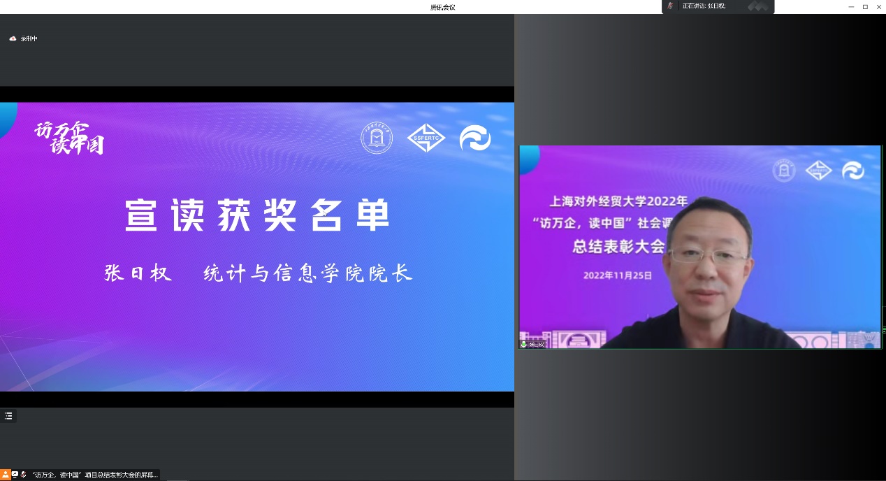 统计与信息学院院长张日权宣读2022年“访万企,读中国”社会调查项目获奖名单。