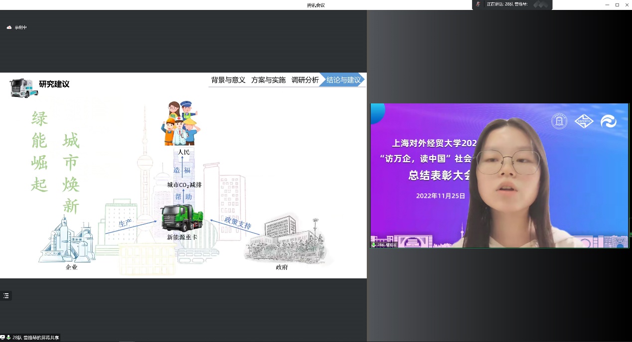 统计与信息学院硕士研究生曾维琴围绕《绿能崛起,城市焕新——疫情冲击下新能源电动重卡产业链变迁趋势与市场测度研究》主题,分享团队从产业链视角对长三角地区新能源电动重卡企业调研成果。该项目获2022年“知行杯”上海市大学生社会实践大赛二等奖。