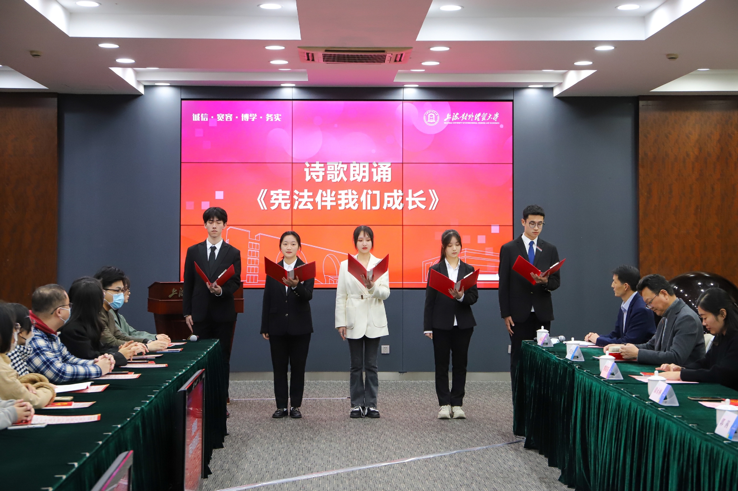 启动仪式上,郭茜、缪韵笛分别代表党委宣传部和学工部为学生赠送了《中华人民共和国宪法》。法学院学生代表表演了诗朗诵《宪法伴我们成长》,师生共同观看了宪法宣传片。最后,与会领导和嘉宾共同按下活动启动球,正式拉开本次“宪法宣传周”活动序幕。