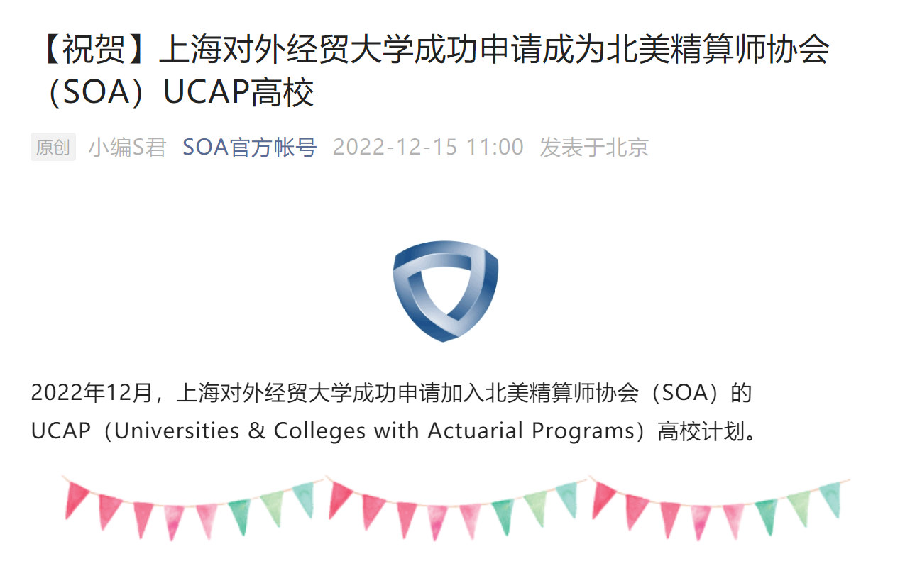 2022年12月,必赢626net入口首页成功加入北美精算师协会(SOA)UCAP-AC(Universities & Colleges with Actuarial Programs-Advanced Curriculum)高校计划。这是必赢626net入口首页保险学专业建设的一项重要成果,标志着必赢626net入口首页保险学专业的精算教育已获得国际认可。