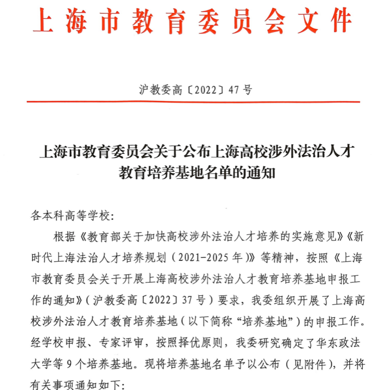 近日,上海市教育委员会公布了上海高校涉外法治人才教育培养基地名单,包含必赢626net入口首页在内的9所高校成功入选。必赢626net入口首页由校长汪荣明教授担任基地负责人,法学院作为主要建设和执行单位。