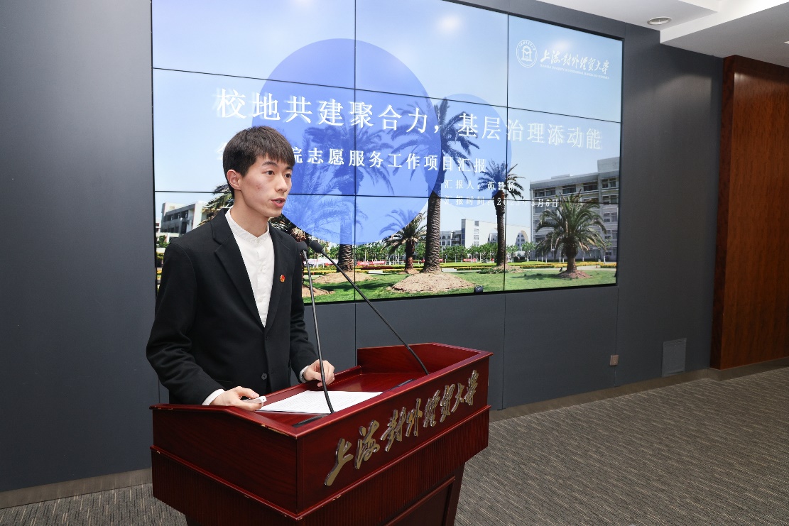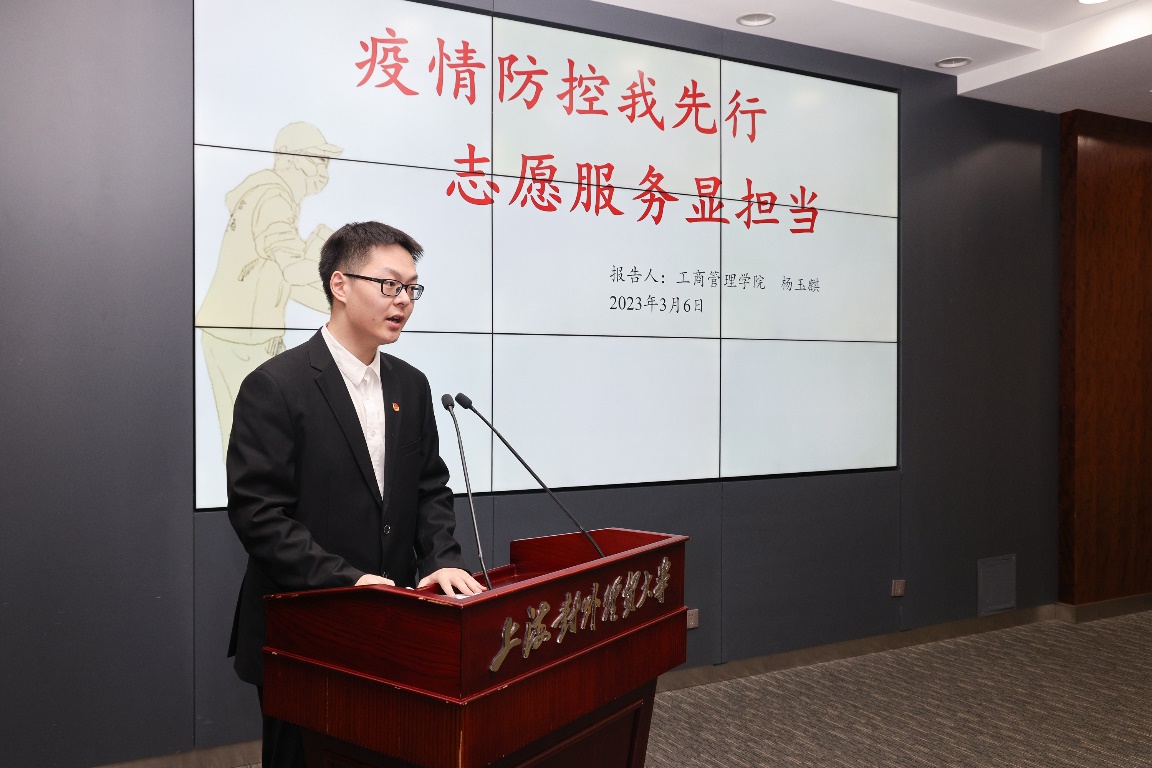 先进个人代表、工商管理学院杨玉麒分享了参与学生社区疫情防控的志愿经历,用一组组疫情防控的数据讲述了志愿者们在抗疫一线持续坚守、全力以赴开展志愿服务的难忘回忆。他呼吁同学们在志愿服务中以奋斗与奉献诠释青年一代的责任与担当。