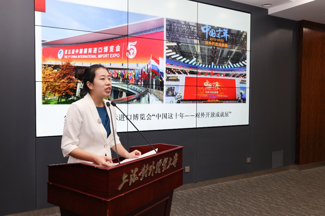 先进集体代表、进博会专题展讲解员团队成员、马克思主义学院孙辉讲述了团队积极克服任务重、时间紧的多重压力,连续两年顺利完成重大讲解任务的励志故事,收到了商务部外贸发展事务局的来函感谢。她号召同学们以奋斗的姿态激扬青春,不负时代,不负华年。