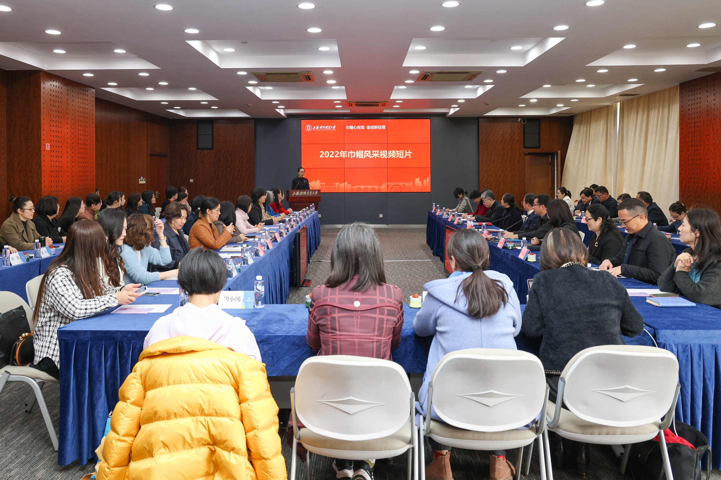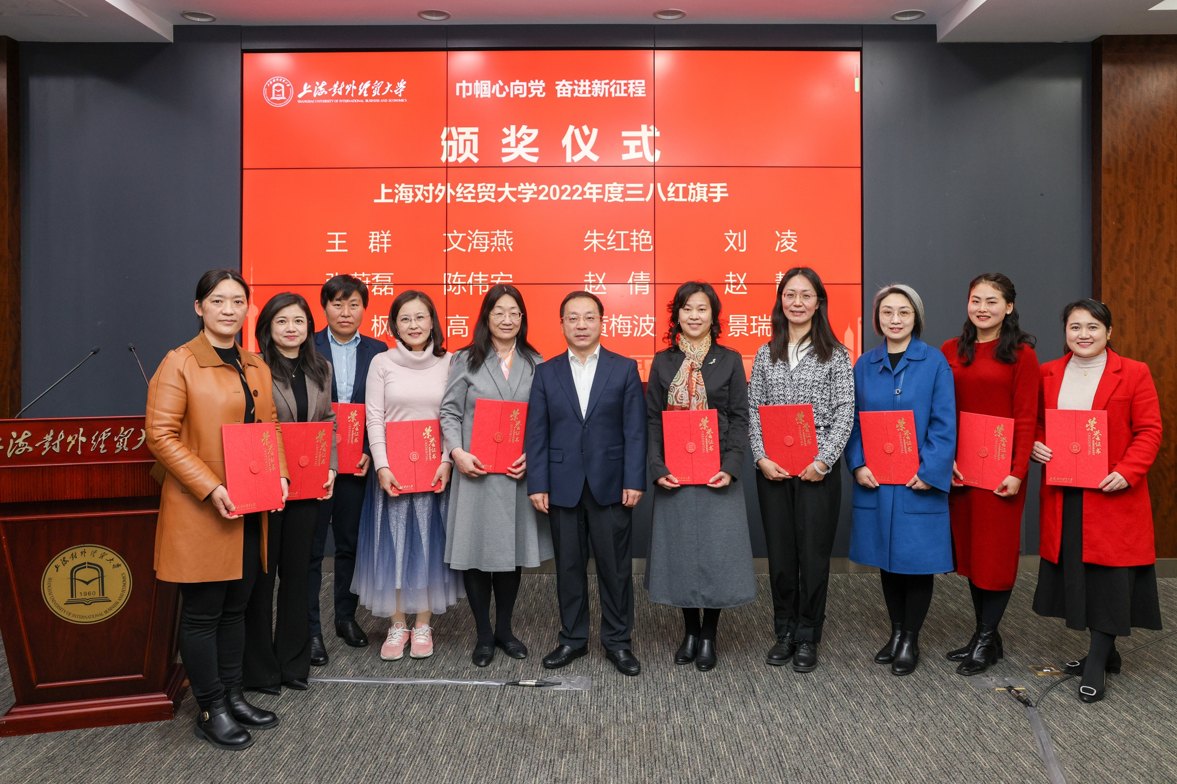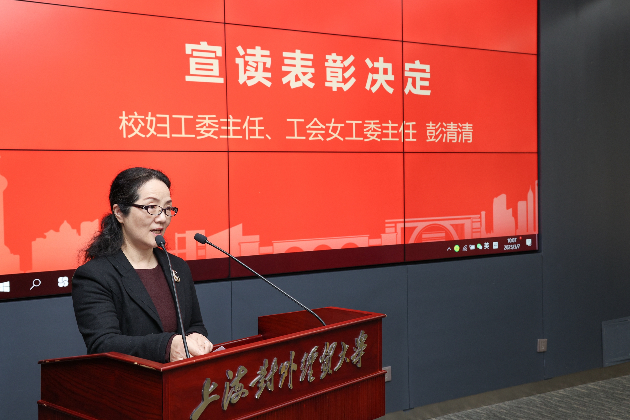 校妇工委主任、工会女工委主任彭清清宣读了表彰决定,会计学院审计系、党委宣传部、研究生院、马克思主义基本原理教研室、外语学院法语系、法学院公共管理学系、工商管理学院人力资源管理系、纪委(监察专员办公室)、国际经贸创新与治理研究院(智库中心)、统计与信息学院应用数学系荣获2022年度校级三八红旗集体。王群、文海燕、朱红艳、刘凌、张蔚磊、陈伟宏、赵倩、赵静、殷枫、高阳、黄梅波、景瑞琴荣获2022年度校级三八红旗手。