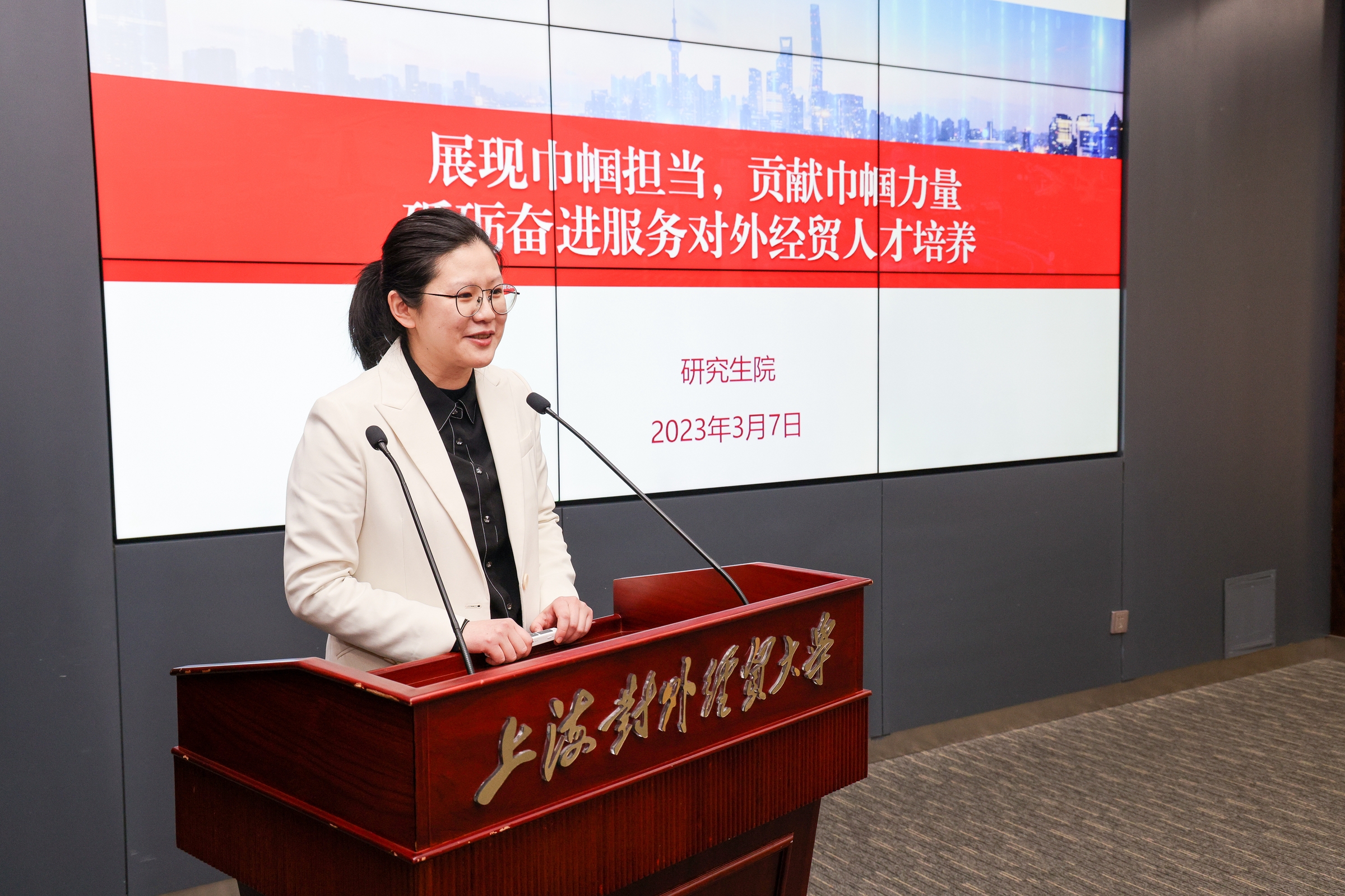 会上,校级三八红旗集体获奖单位研究生院郝程程、校级三八红旗手代表金融学院刘凌分别进行了交流发言。