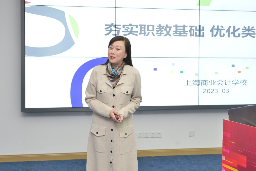 上海商业会计学校校长乔蔓菁,以“夯实职教基础 优化类型定位”为题,分享了如何依托党委、上级主管部门不断开拓社会合作范围、拓展师生社会实习实践平台;通过校企协同育人,逐步打造双师型队伍,构建专业群的经验做法。