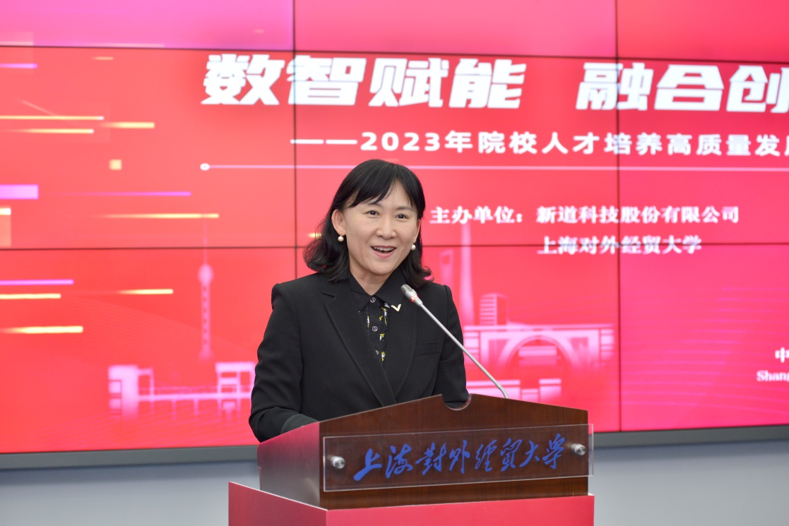 徐永林代表学校向与会的企业嘉宾和高校专家表示欢迎。他结合学校的发展历史与学科特色,表达了学校对产教融合、科教融汇、借助行业产业做好专业建设与人才培养的重视。他强调,党的二十大报告中提到“教育、科技、人才是全面建设社会主义现代化国家的基础性、战略性支撑”的重要论断,为院校人才培养指出了高质量发展的路径与方法,学校将与新道等行业领先企业、各兄弟院校一起,共同谋划开展合作,探索数智时代高等教育品牌特色,培养行业需求的高质量人才,共同为上海经济和国家腾飞做出贡献。