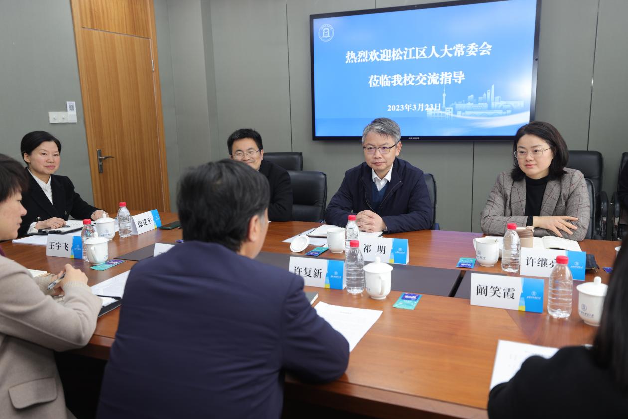 3月23日上午,松江区人大常委会副主任许复新一行来必赢626net入口首页调研指导并看望区人大代表、国际经贸学院院长何欢浪教授,广富林街道人大工委副主任王欢、区人大财经委财经科科长阚笑霞、广富林街道社区党建办主任王宇飞陪同调研。校党委副书记、副校长祁明会见了许复新一行,校党委常委、统战部部长许继亮,资产管理处处长张彦,学校致公党支部主委徐建平参加调研座谈会。