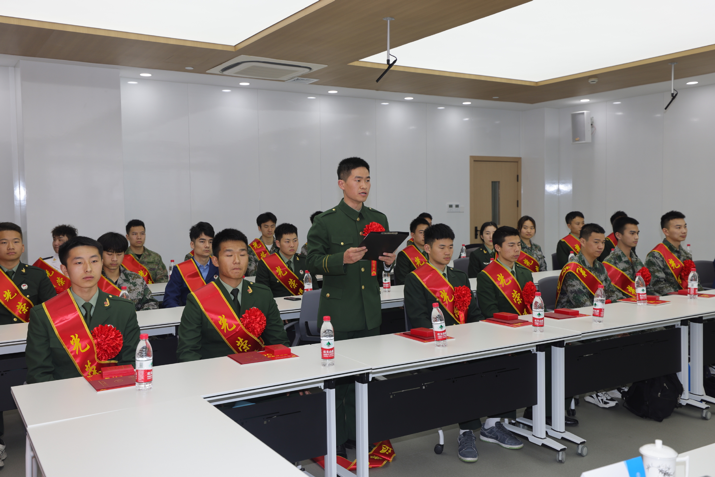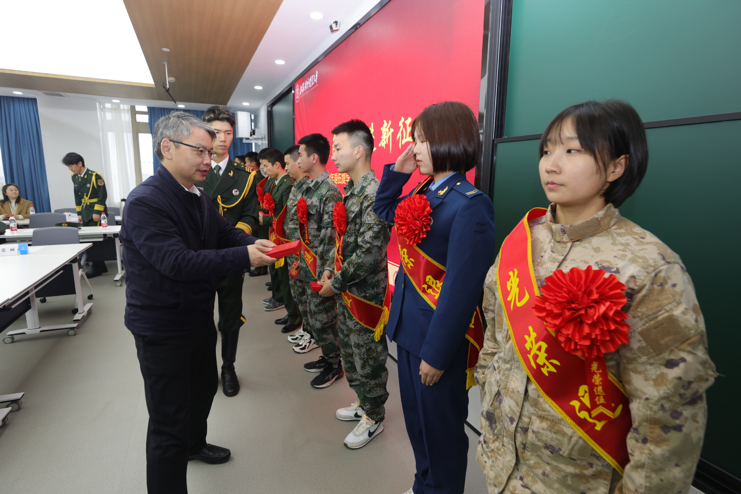 祁明代表学校向退伍复学学生载誉荣归表示热烈欢迎,对他们在青春年华作出参军入伍的选择表示充分的肯定和赞扬。他就退伍复学学生接下来如何更好地适应校园生活提出了三点希望:一要尽快转变角色,主动适应环境,把每一次的角色转变转化为个人的成长;二要做好未来规划,接续逐梦奋斗,积极应对就业、升学的人生十字路口;三要永葆军人本色,发挥模范作用,在校园“新战场”再创佳绩。