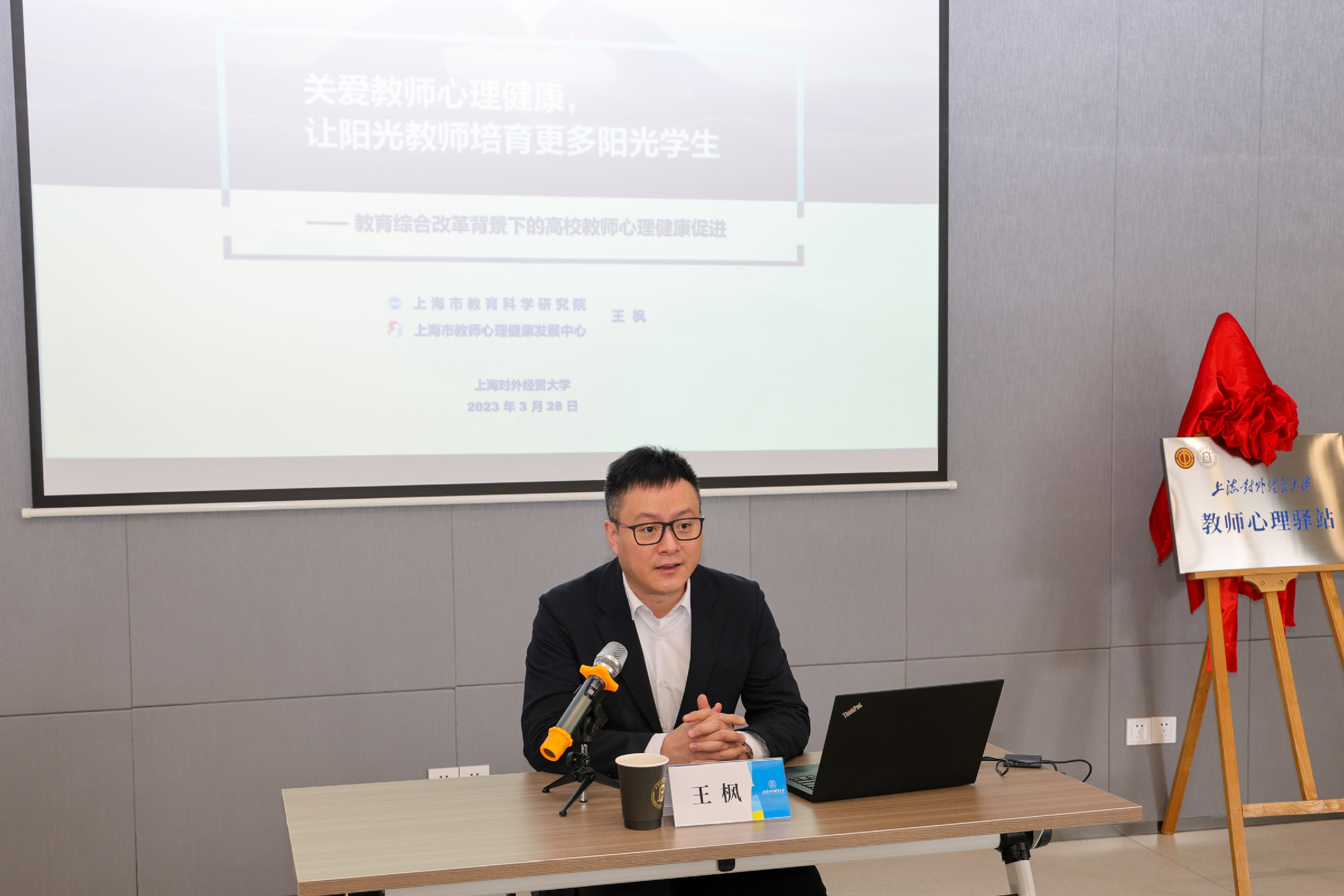 揭牌仪式后,上海市教师心理健康发展中心副主任、上海市教育科学研究院普教所学生发展研究中心主任王枫作主题为“关爱教师心理健康,让阳光教师培育更多阳光学生——教育综合改革背景下的高校教师心理健康促进”教师心理健康工作培训首场讲座。王枫以教师专业发展中不容忽视的心理健康问题为切入点,阐述了教师职业心理健康的重要性,并结合案例分析详细介绍了教师心理健康观念和现状特点,对于帮助我们进一步提高教师心理健康认识,增强教师心理健康素养,提升教师心理健康促进工作的实践能力,具有十分重要的指导作用。