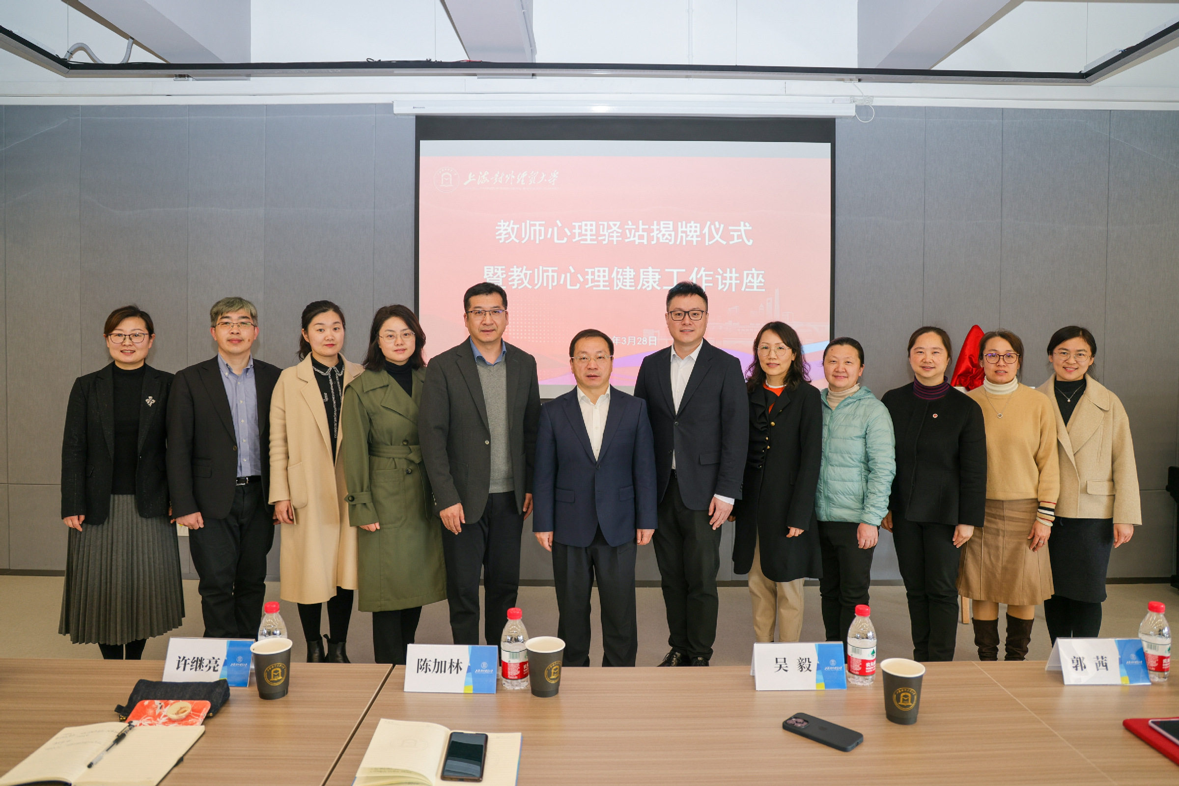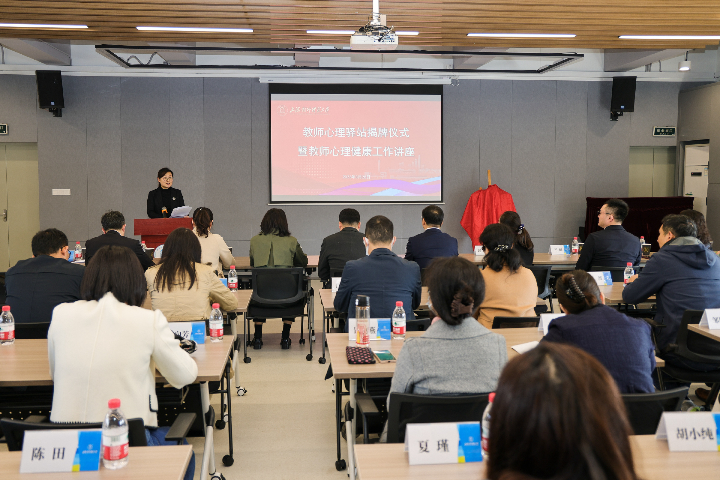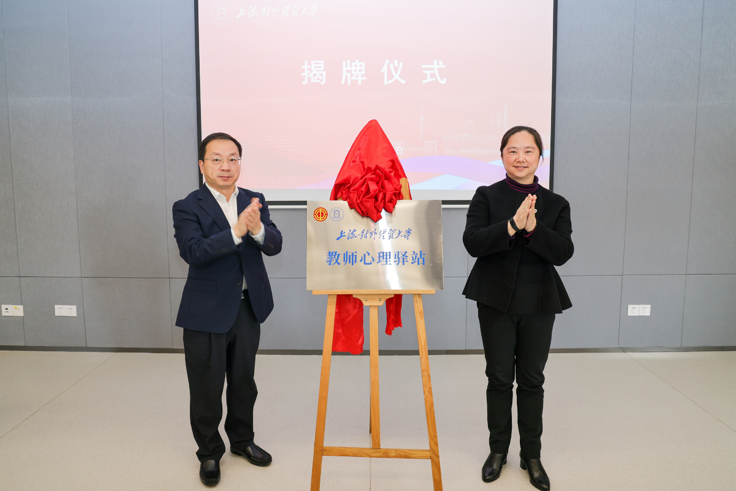 仪式上,校党委副书记、工会主席吴毅和校党委常委、党委宣传部部长、国际经贸学院党委书记郭茜为教师心理驿站揭牌。