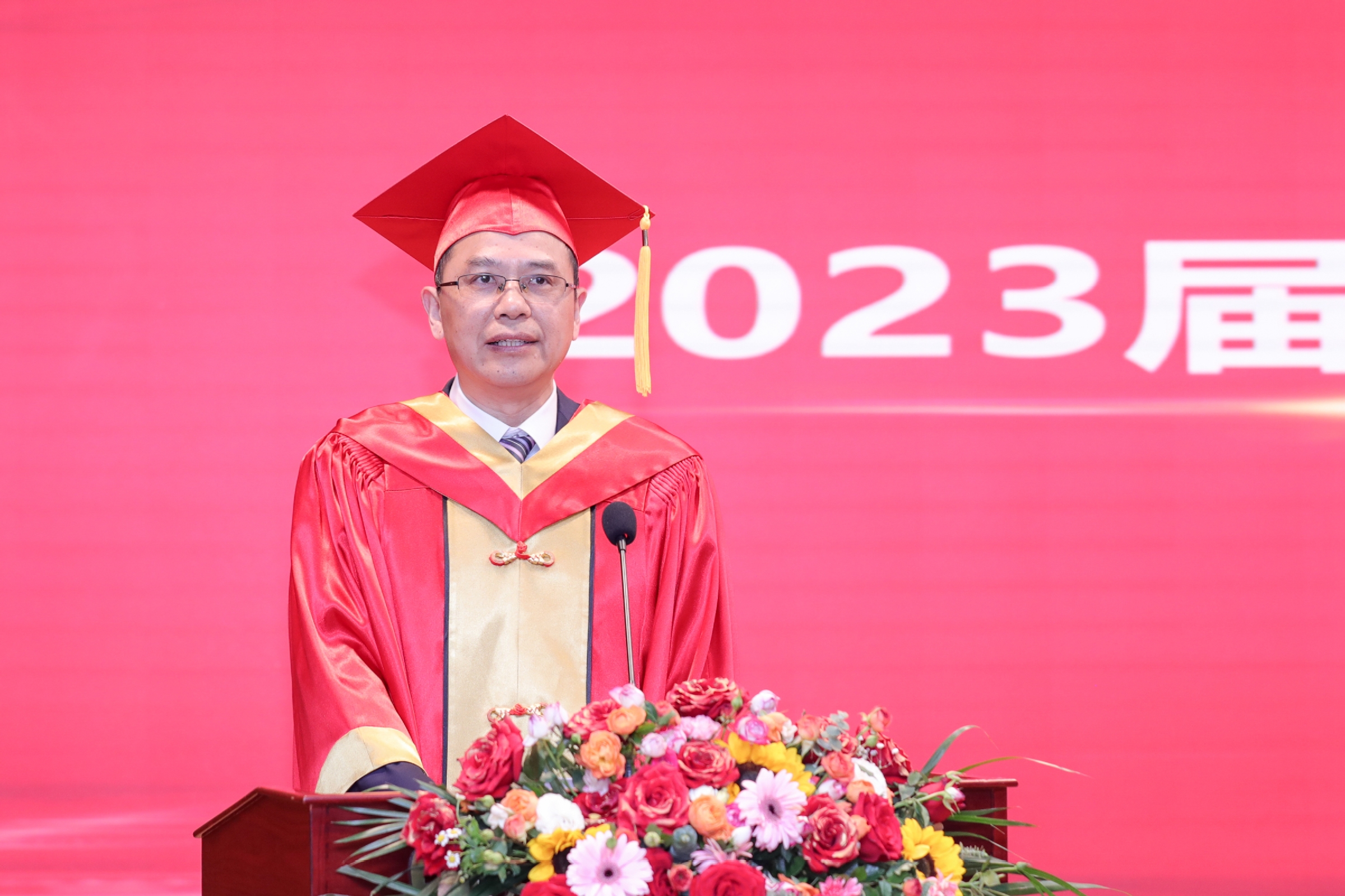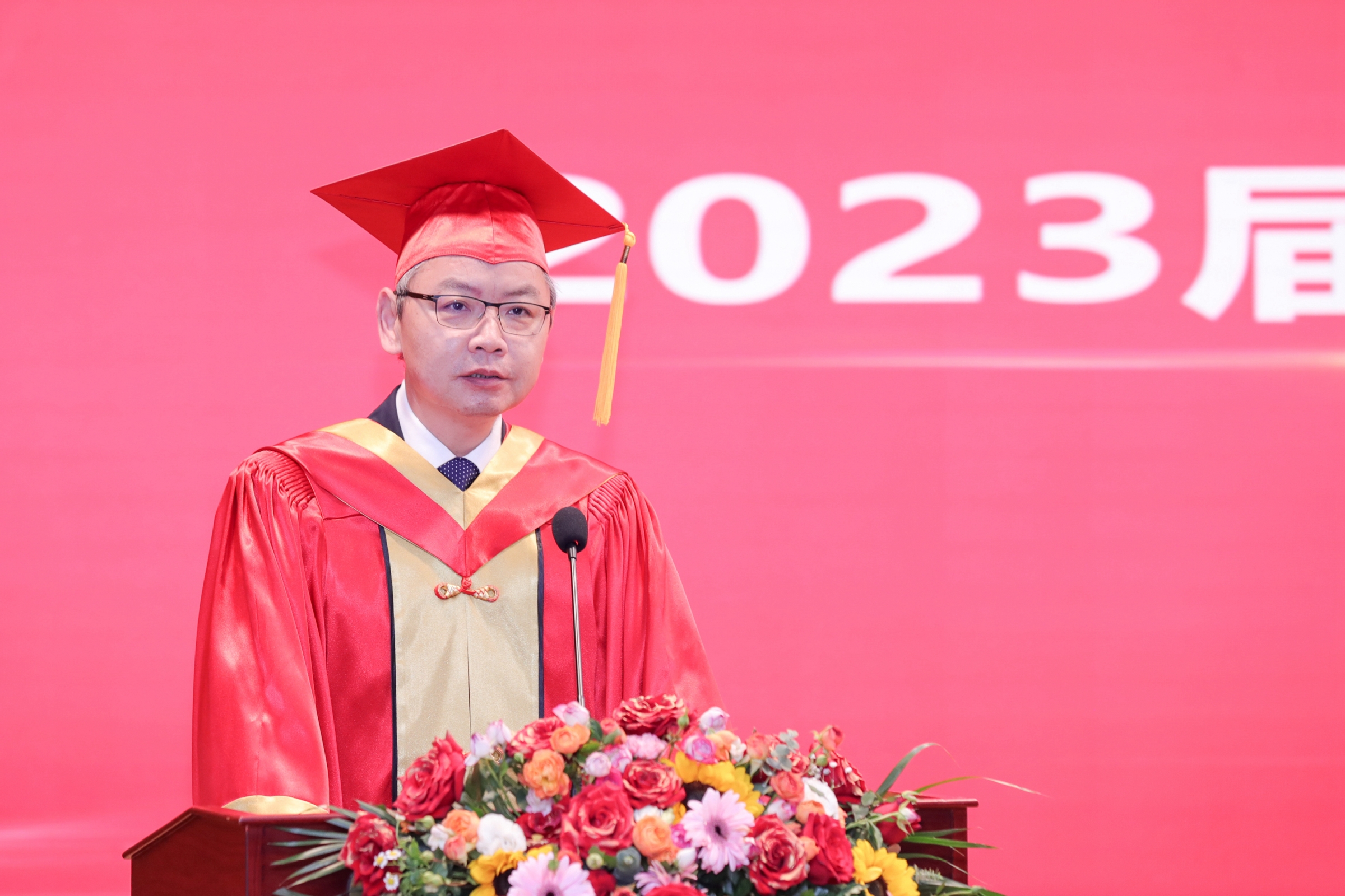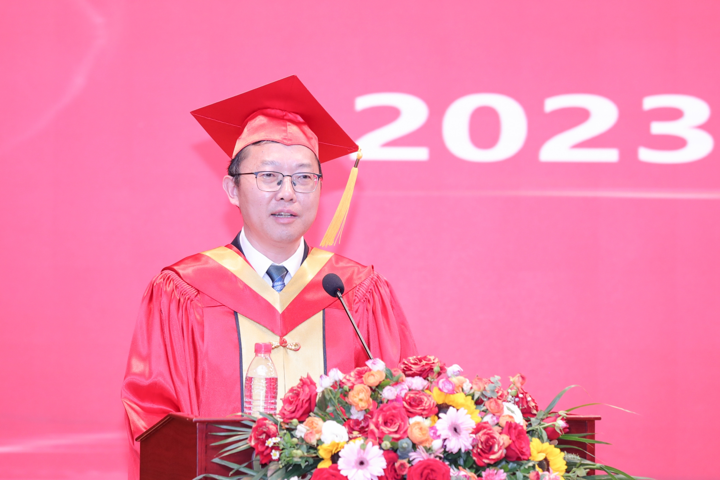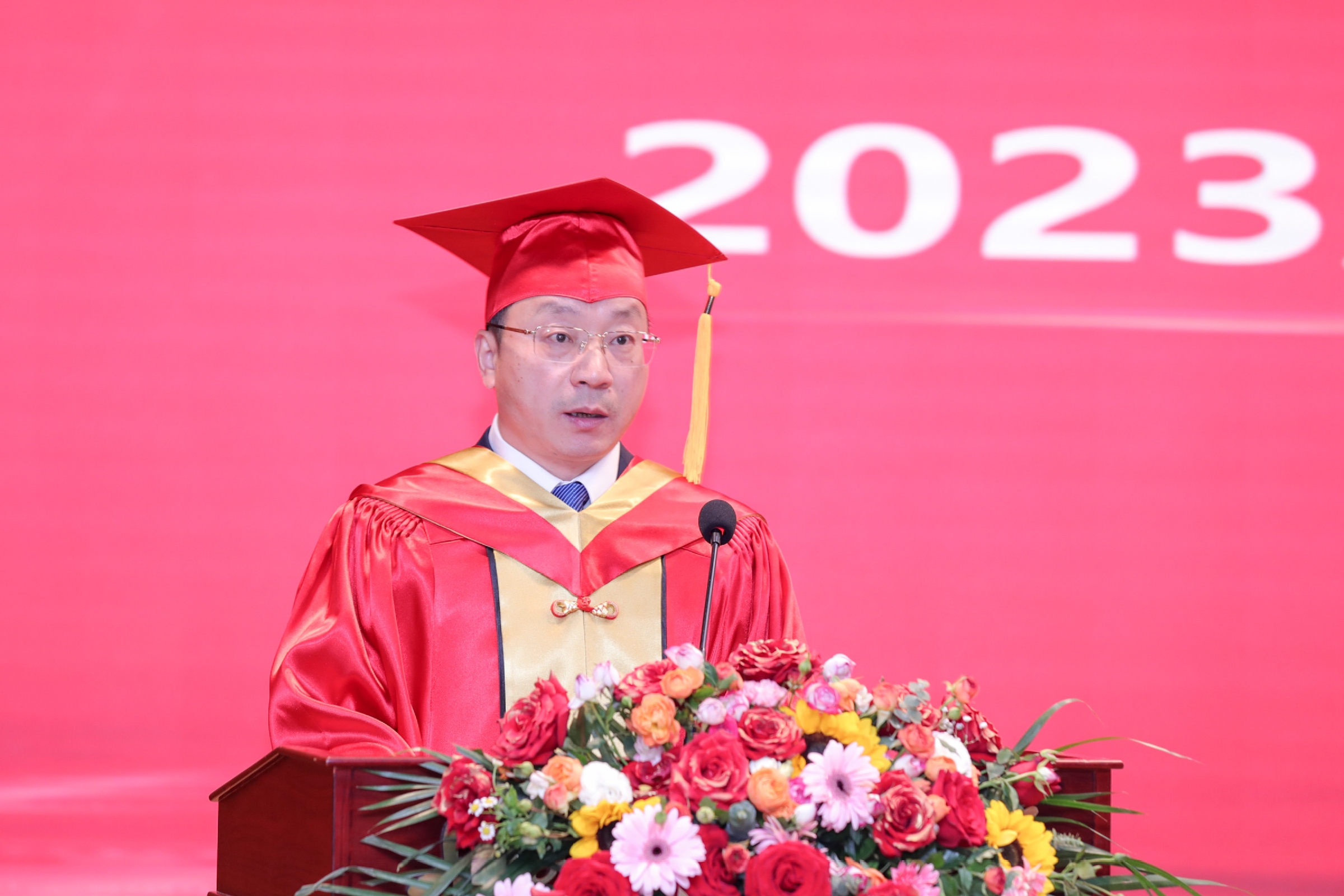 校长汪荣明以《扎根热土 力拔云天》为题发表讲话。他首先代表学校广大师生员工,向怀着光荣与梦想、踏上追梦之旅的毕业生表示祝贺,向站在学生身后默默奉献支持的师长、父母和亲友表示感谢,并对2023届研究生在敢于担当、善于学习、精于研究等方面取得的成绩给予了充分肯定。