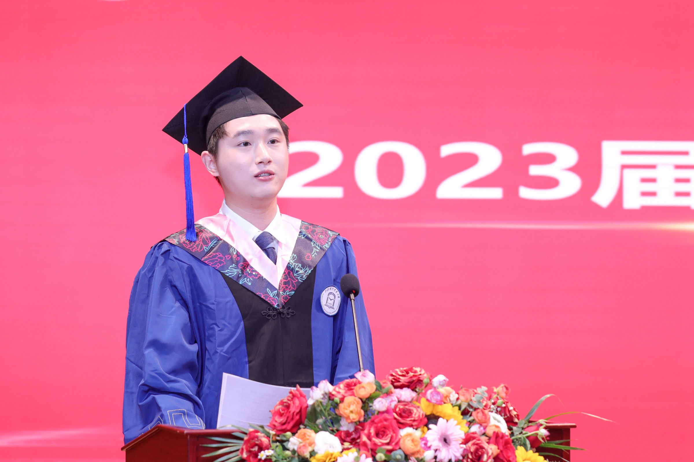 在代表发言环节,统计与信息学院王文彦同学代表全体2023届研究生毕业生分享了自己的成长感悟,感谢母校给予上经贸大学子们的蓬勃力量,表示将会带着上经贸大学子肩负的光荣与使命,从这里启航,奔赴新的伟大梦想。