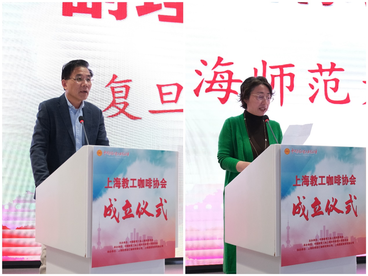 复旦大学工会副主席孙钢、上海师范大学天华学院工会常务副主席曹卫作为副理事长单位代表先后发言,结合本校特点,介绍了学校在教工咖啡文化普及方面的开展情况,表达了对协会成立的祝贺,期待协会搭建更多咖啡文化分享平台,切实提升咖啡文化普及和教职工咖啡技能。