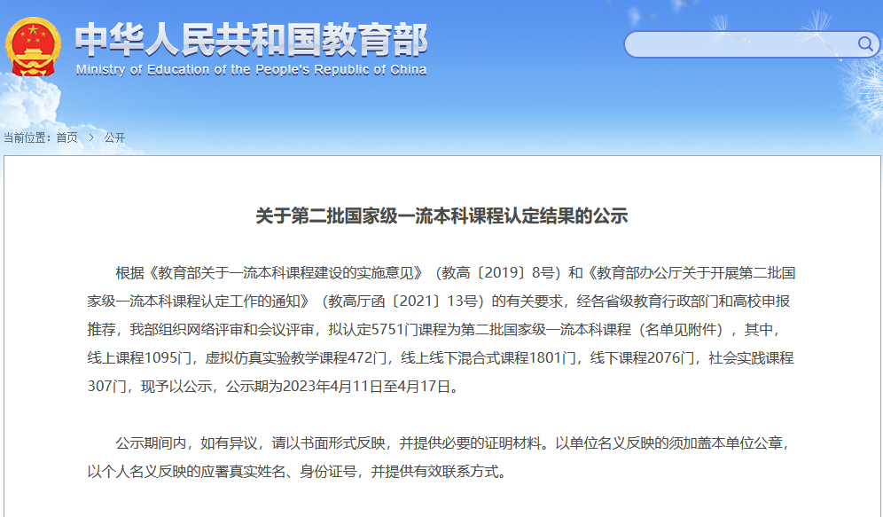 近日,教育部印发了《关于第二批国家级一流本科课程认定结果的公示》,拟认定5751门课程为第二批国家级一流本科课程。