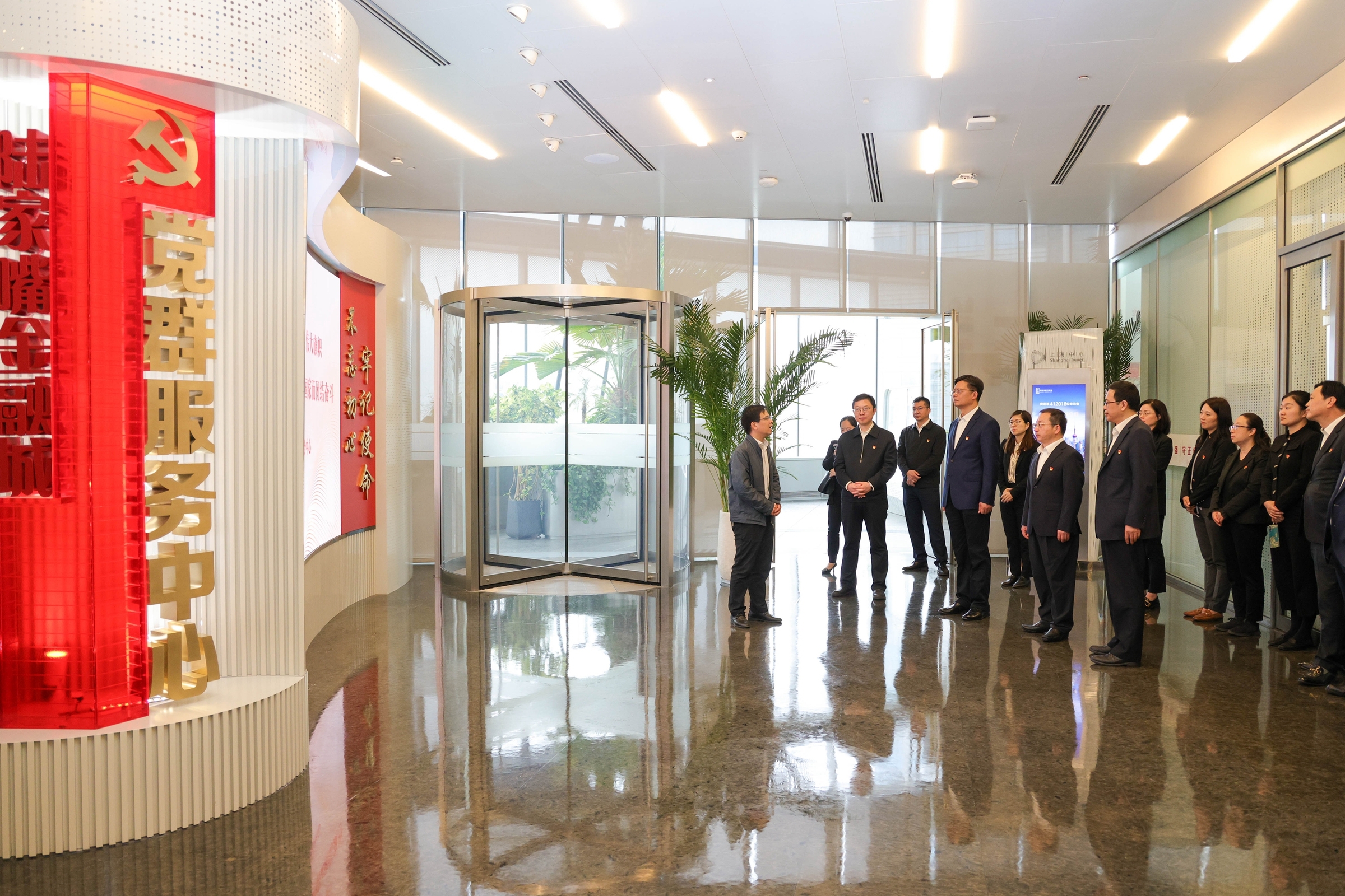 陆家嘴金融城党群服务中心是此次巡访调研的第三站。2018年11月,习近平总书记考察位于上海中心大厦22层的陆家嘴金融城党群服务中心,勉励“在加强基层党建工作上继续探索、走在前头”。陆家嘴管理局党群工作处处长何建木详细介绍了陆家嘴金融城的发展历史,以及加强基层党建工作的先进经验和典型做法,重温习近平总书记考察时关于基层党建工作的重要讲话精神,并就双方如何以高质量党建引领高质量事业发展,共同服务好上海和国家重大战略进行交流。